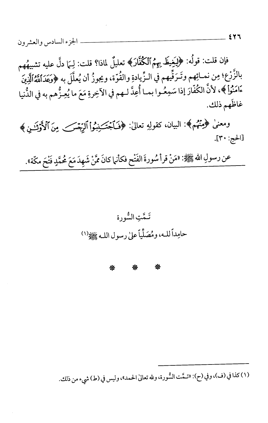 فإن قلت: قوله: {لِيَغِيظَ بِهِمُ الْكُفَّارَ} تعليل لماذا؟ قلت: لما دل عليه تشبيههم بالزرع؛ من نمائهم وترقيهم في الزيادة والقوّة، ويجوز أن يعلل به {وَعَدَ اللَّهُ الَّذِينَ آمَنُوا}، لأنّ الكفار إذا سمعوا بما أعدّ لهم في الآخرة مع ما يعزهم به في الدنيا غاظهم ذلك.