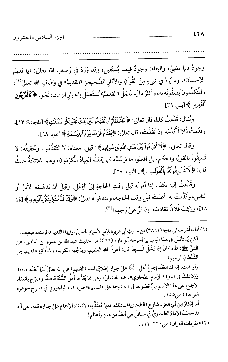 وجود فيما مضى، والبقاء: وجود فيما يستقبل، وقد ورد في وصف الله تعالى: "يا قديم الإحسان"، ولم يرد في شيء من القرآن والآثار الصحيحة "القديم" في وصف الله تعالى، والمتكلمون يصفونه به، وأكثر ما يستعمل "القديم" يستعمل باعتبار الزمان، نحو: {كَالْعُرْجُونِ الْقَدِيمِ} [يس: 39].