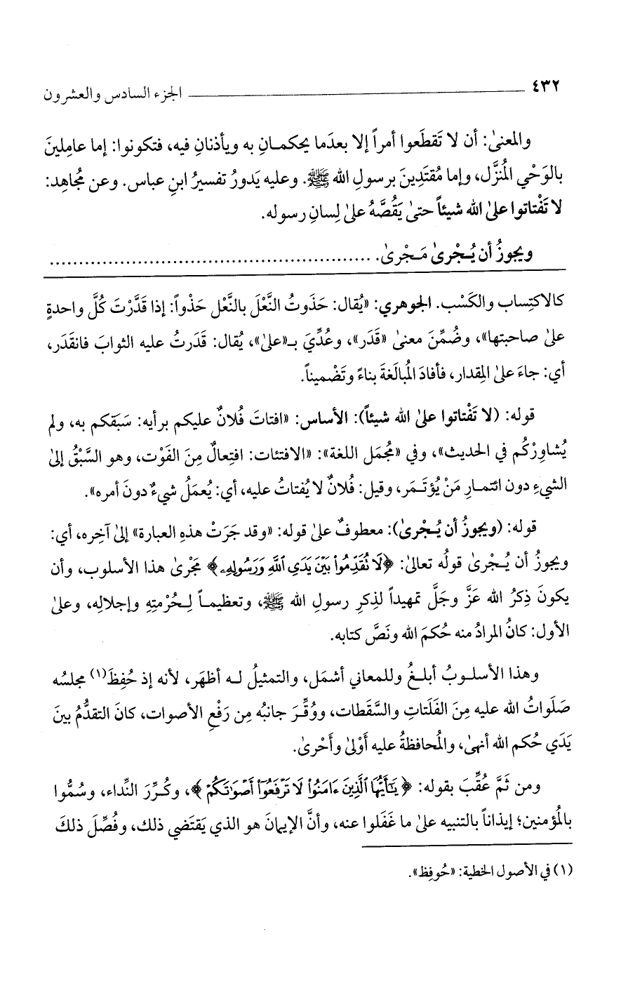 والمعنى: أن لا تقطعوا أمرًا إلا بعد ما يحكمان به ويأذنان فيه، فتكونوا: إما عاملين بالوحي المنزل، وإما مقتدين برسول الله صلى الله عليه وسلم. وعليه يدور تفسير ابن عباس. وعن مجاهد: لا تفتاتوا على الله شيئًا حتى يقصه على لسان رسوله.