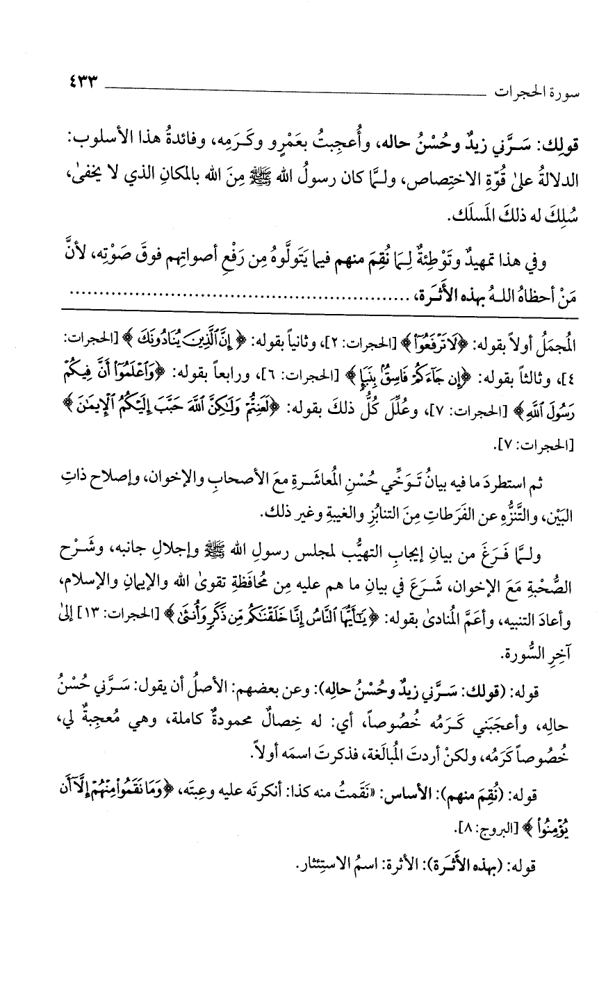 المجمل أولًا بقوله: {لا تَرْفَعُوا} [الحجرات: 2]، وثانيًا بقوله: {إنَّ الَّذِينَ يُنَادُونَكَ} [الحجرات: 4]، وثالثًا بقوله: {إن جَاءَكُمْ فَاسِقٌ بِنَبَأٍ} [الحجرات: 6]، ورابعًا بقوله: {واعْلَمُوا أَنَّ فِيكُمْ رَسُولَ اللَّهِ} [الحجرات: 7]، وعلل كل ذلك بقوله: {لَعَنِتُّمْ ولَكِنَّ اللَّهَ حَبَّبَ إلَيْكُمُ الإيمَانَ} [الحجرات: 7].