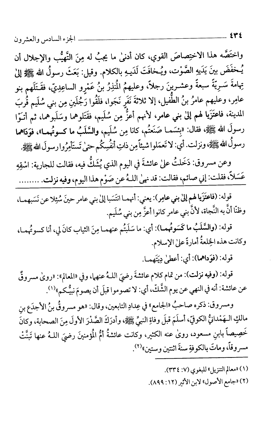 ومسروق: ذكره صاحب"الجامع" في عداد التابعين، وقال: "هو مسروق بن الأجدع بن مالك الهمداني الكوفي، أسلم قبل وفاة النبي صلى الله عليه وسلم، وأدرك الصدر الأول من الصحابة، وكان خصيصًا بابن مسعود، روى عنه الكثير، وكانت عائشة أم المؤمنين رضي الله عنها تبنت مسروقًا، ومات بالكوفة سنة اثنتين وستين".