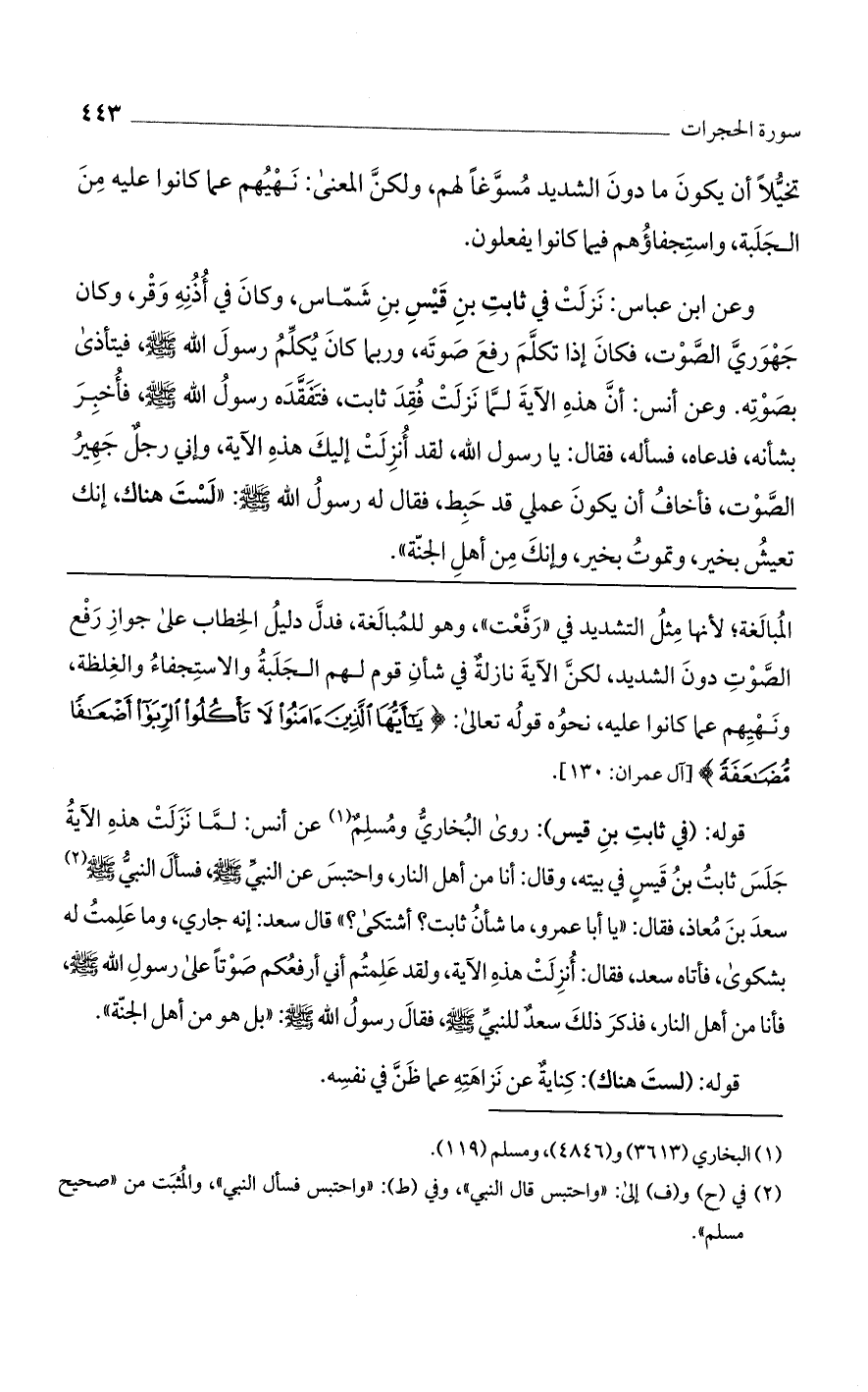 قوله: (في ثابت بن قيس): روى البخاري ومسلم عن أنس: لما نزلت هذه الآية جلس ثابت بن قيس في بيته، وقال: أنا من أهل النار، واحتبس عن النبي صلى الله عليه وسلم، فسأل النبي صلى الله عليه وسلم سعد بن معاذ، فقال: "يا أبا عمرو، ما شأن ثابت؟ أشتكى؟ " قال سعد: إنه جاري، وما علمت له بشكوى، فأتاه سعد، فقال: أنزلت هذه الآية، ولقد علمتم أني أرفعكم صوتًا على رسول الله صلى الله عليه وسلم، فأنا من أهل النار، فذكر ذلك سعد للنبي صلى الله عليه وسلم، فقال رسول الله صلى الله عليه وسلم: "بل هو من أهل الجنة".