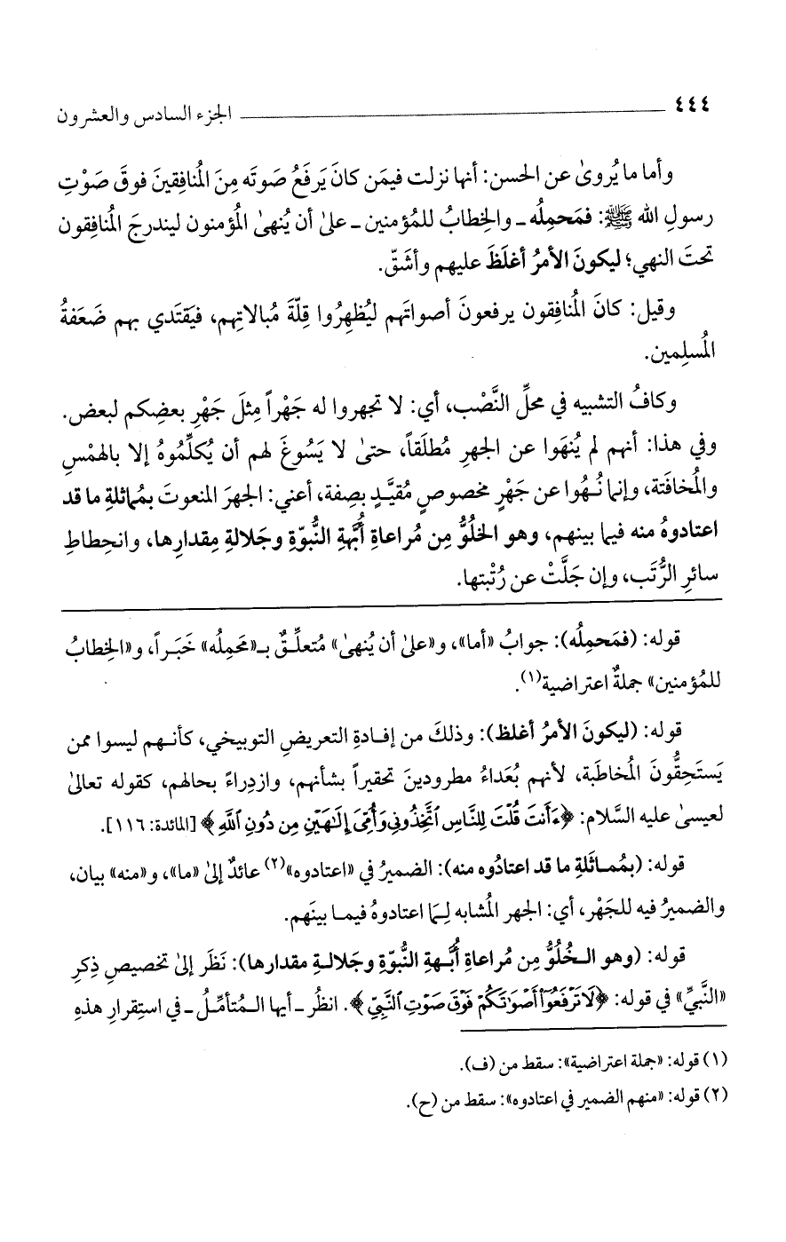 قوله: (وهو الخلو من مراعاة ابهة النبوة وجلالة مقدارها): نظر إلى تخصيص ذكر "النبي" في قوله: {لا تَرْفَعُوا أَصْوَاتَكُمْ فَوْقَ صَوْتِ النَّبِيِّ}. انظر - أيها المتأمل - في استقرار هذه