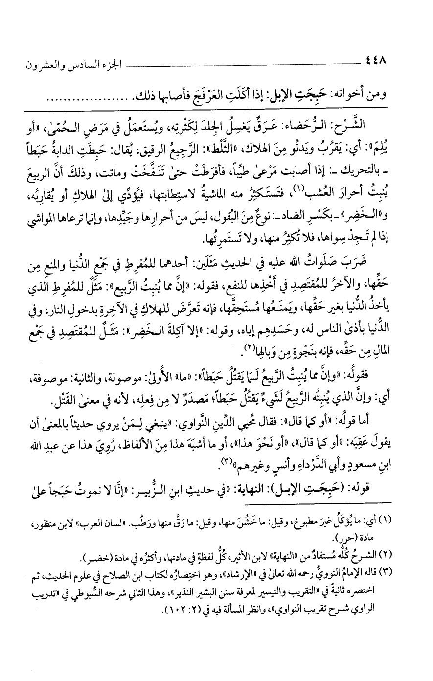 الشرح: الرحضاء: عرق يغسل الجلد لكثرته، ويستعمل في مرض الحمى، "أو يلم": أي: يقرب ويدنو من الهلاك، " الثلط": الرجيع الرقيق، يقال: حبطت الدابة حبطًا_بالتحريك_: إذا أصابت مرعى طيبًا، فأفرطت حتى تنفخت وماتت، وذلك أن الربيع ينبت أحرار العشب، فتستكثر منه الماشية لا ستطابتها، فيؤدي إلى الهلاك أو يقاربه، و"الخضر"_ بكسر الضاد_: نوع من البقول، ليس من أحرارها وجيدها، وإنما ترعاها المواشي إذا لم تجد سواها، فلا تكثر منها، ولا تستمرئها.