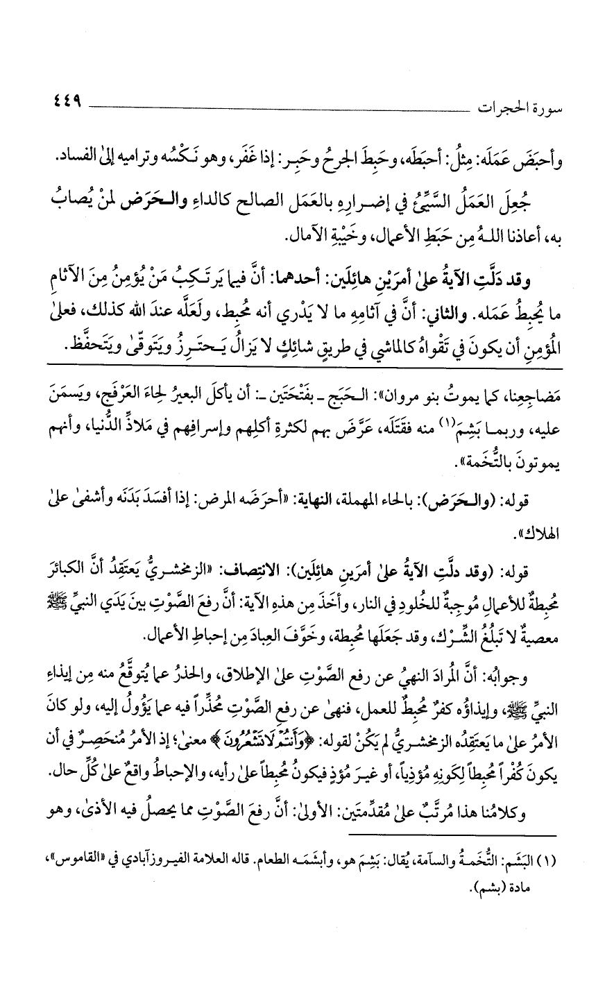 وجوابه: أن المراد النهي عن رفع الصوت على الإطلاق، والحذر عما يتوقع منه من إيذاء النبي صلى الله عليه وسلم، وإيذاؤه كفر محبط للعمل، فنهى عن رفع الصوت محذوًا فيه عما يؤول إليه، ولو كان الأمر على ما يعتقده الزمخشري لم يكن لقوله: {وأَنتُمْ لا تَشْعُرُونَ} معنى؛ إذ الأمر منحصر في أن يكون كفرًا محبطًا لكونه مؤذيًا، أو غير مؤذ فيكون محبطًا على رأيه، والإحباط واقع على كل حال.