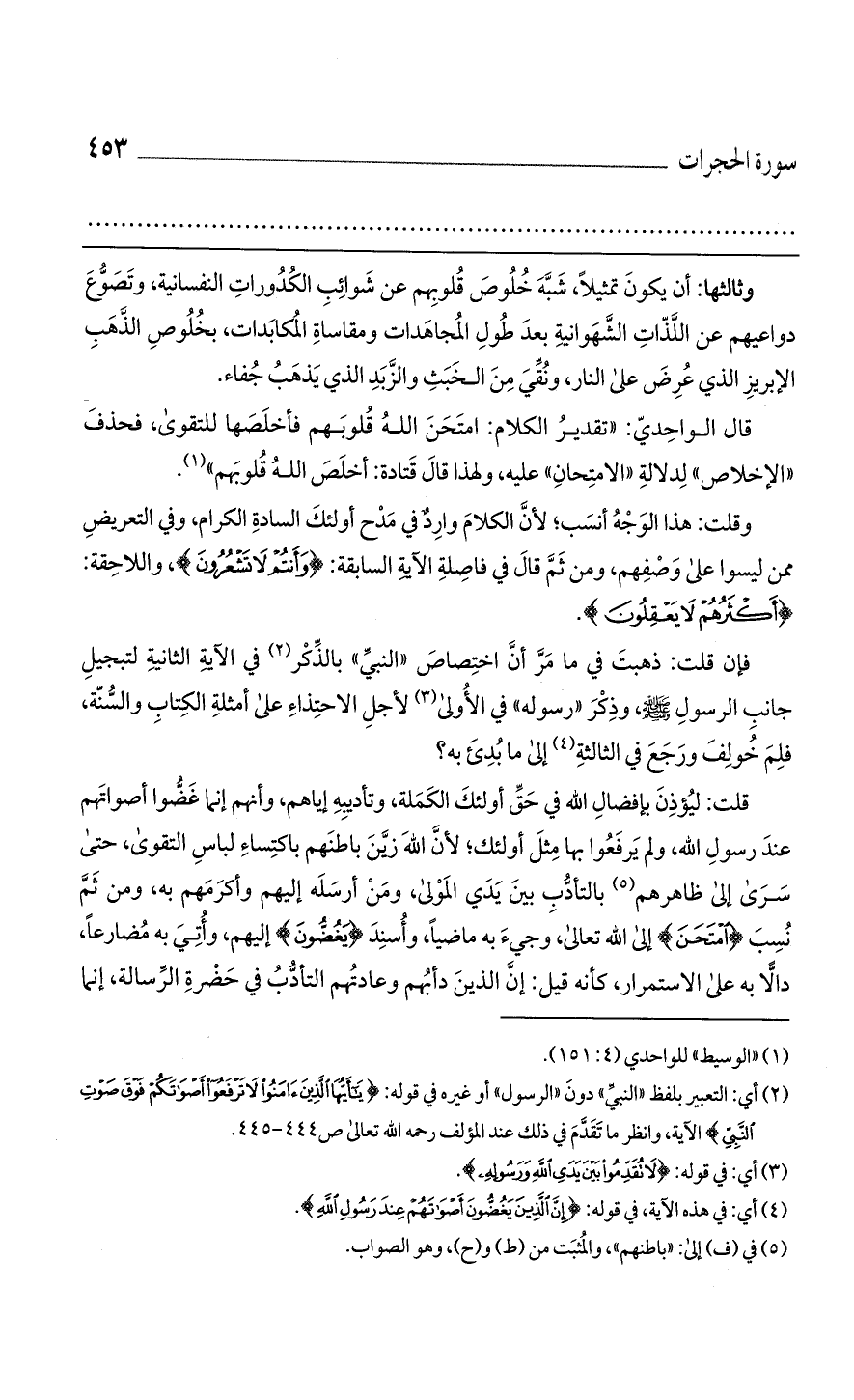 وقلت: هذا الوجه أنسب؛ لأن الكلام وارد في مدح أولئك السادة الكرام، وفي التعريض ممن لسوا على وصفهم، ومن ثم قال في فاصلة الآية السابقة: {وأَنتُمْ لا تَشْعُرُونَ}، واللاحقة: {أَكْثَرُهُمْ لا يَعْقِلُونَ} فإن قلت: ذهبت في ما مر أن اختصاص "النبي" بالذكر في الآية الثانية لتبجيل جانب الرسول صلى الله عليه وسلم، وذكر"رسوله" في الأولى لأجل الاحتذاء على أمثلة الكتاب والسنة، فلم خولف ورجع في الثالثة إلى ما بدئ به؟
