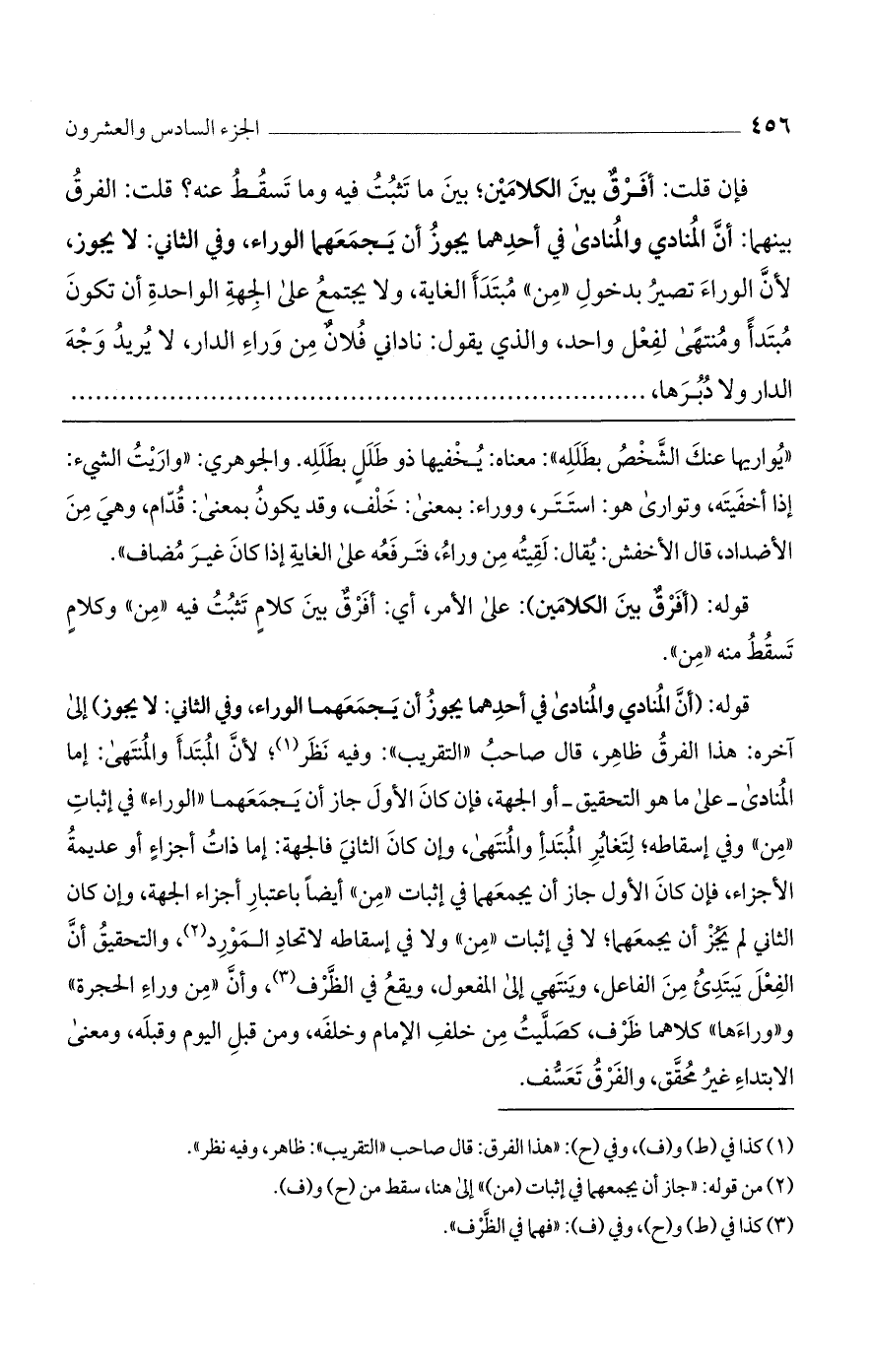 قوله: (أن المنادى في أحدهما يجوز أن يجمعها الوراء، وفي الثاني: لا يجوز) إلى آخره: هذا الفرق ظاهر، قال صاحب "التقريب": وفيه نظر؛ لأن المبتدأ والمنتهى: إما المنادى_ على ما هو التحقيق_ أو الجهة، فإن كان الأول جاز أن يجمعهما "لوراء" في إثبات "من" وفي إسقاطه؛ لتغاير المبتدأ والمنتهى، وإن كان الثاني فالجهة: إما ذات أجزاء أو عديمة الأجزاء، فإن كان الأول جاز أن يجمعهما في إثبات"من" أيضًا باعتبار أجزاء الجهة، وإن كان الثاني لم يجز أن يجمعهما؛ لا في إثبات"من" ولا في إسقاطه لاتحاد المورد، والتحقيق أن الفعل يبتدئ من الفاعل، وينتهي إلى المفعول، ويقع في الظرف، وأن "من وراء الحجرة" و"وراءها" كلاهما ظرف، كصليت من خلف الإمام وخلفه، ومن قبل اليوم وقبله، ومعنى الابتداء غير محقق، والفرق تعسف.