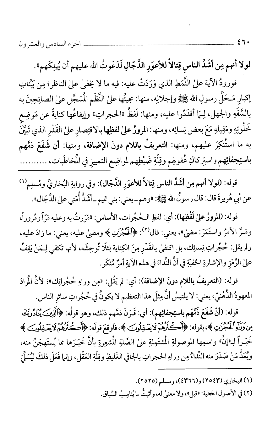 قوله: (التعريف باللام دون الإضافة): أي: لم يقل: "من وراء حجراتك"؛ لأن المراد المعهود الذهني، يعني: لا يلتبس أن مثل هذا التعظيم لا يكون في حجرات سائر الناس.