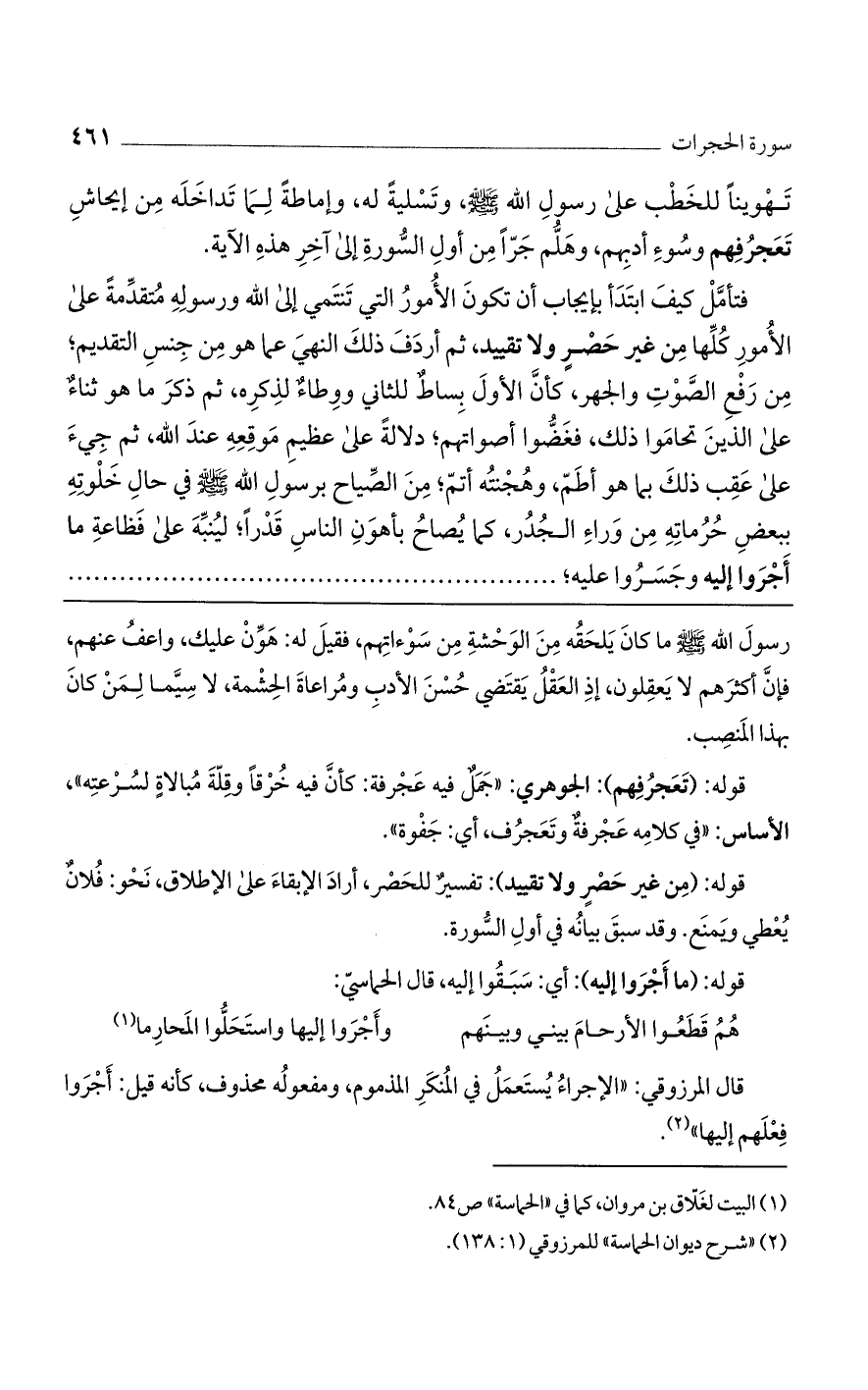 فتأمّل كيف ابتدأ بإيجاب أن تكون الأمور التي تنتمي إلى الله ورسوله متقدّمة على الأمور كلها من غير حصر ولا تقييد، ثم أردف ذلك النهي عما هو من جنس التقديم؛ من رفع الصوت والجهر، كأن الأوّل بساط للثاني ووطاء لذكره، ثم ذكر ما هو ثناء على الذين تحاموا ذلك، فغضوا أصواتهم؛ دلالة على عظيم موقعه عند الله، ثم جيء على عقب ذلك بما هو أطم، وهجنته أتم؛ من الصياح برسول الله صلى الله عليه وسلم في حال خلوته ببعض حرماته من وراء الجدر، كما يصاح بأهون الناس قدرًا؛ لينبه على فظاعة من أجروا إليه وجسروا عليه؛