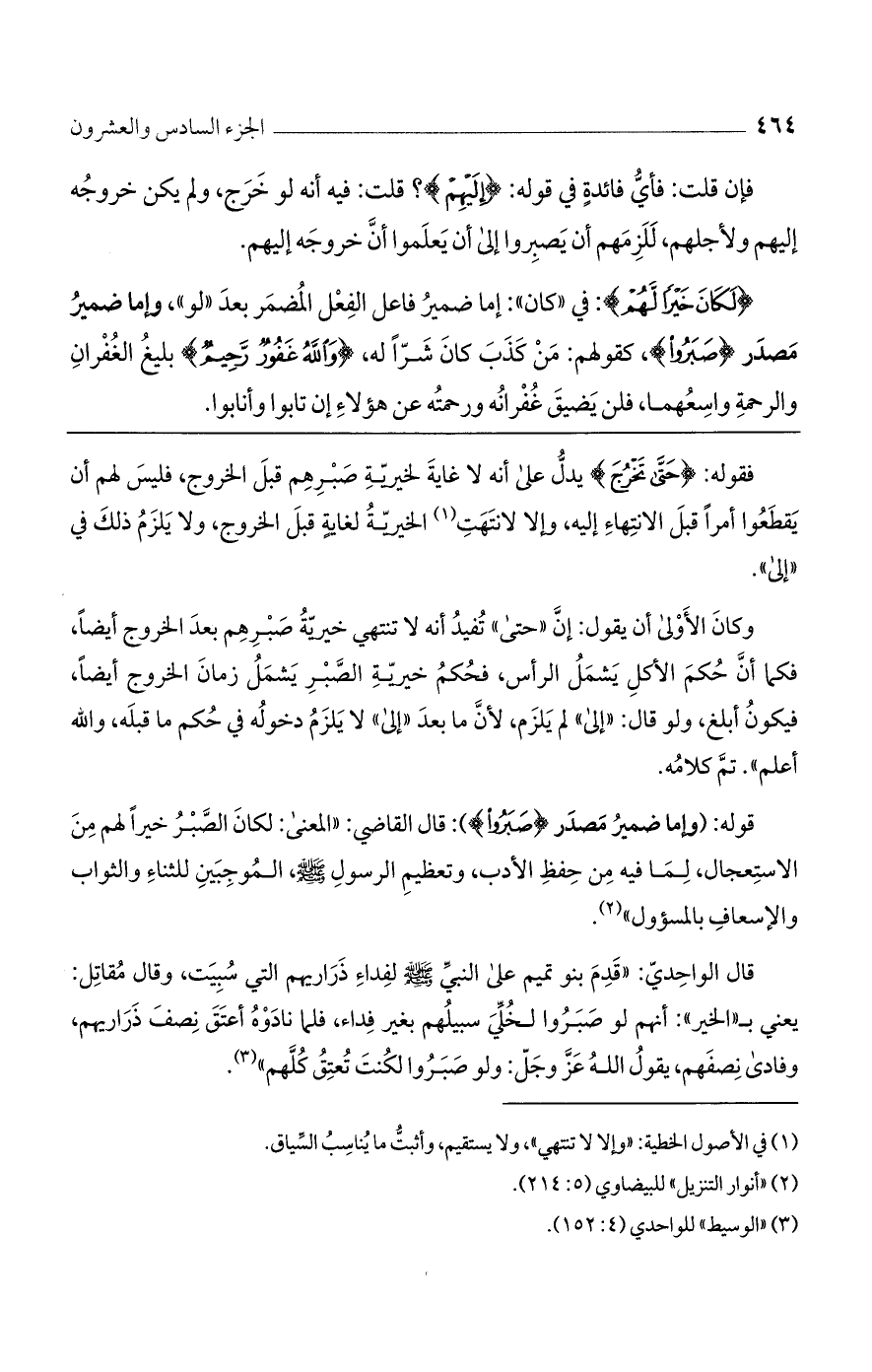 قوله: (وإما ضمير مصدر {صَبَرُوا}): قال القاضي: "المعنى: لكان الصبر خيرًا لهم من الاستعجال، لما فيه من حفظ الأدب، وتعظيم الرسول صلى الله عليه وسلم، الموجبين للثناء والثواب والإسعاف بالمسؤول".