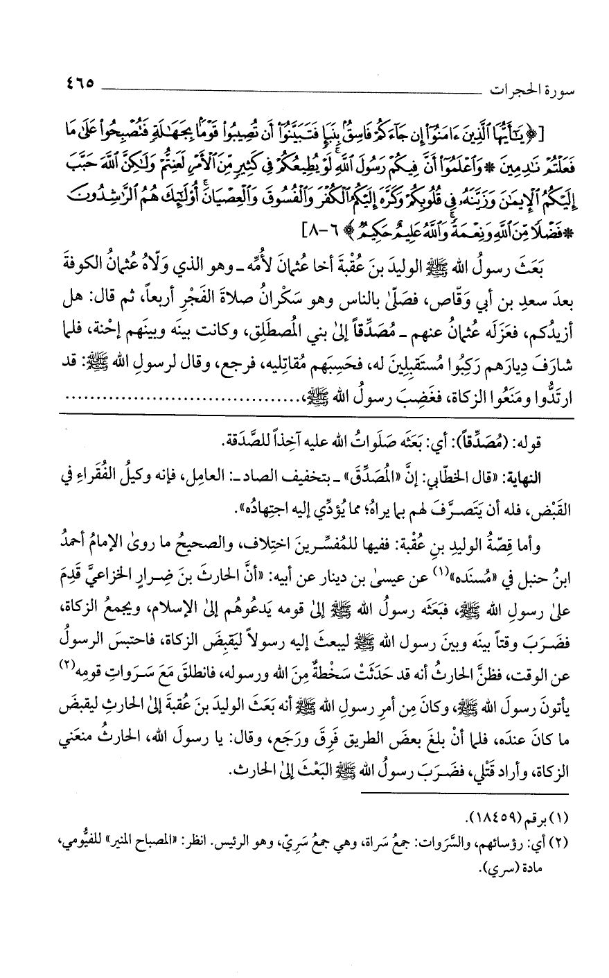 وأما قصة الوليد بن عقبة: ففيها للمفسرين اختلاف، والصحيح ما روى الإمام أحمد ابن حنبل في "مسنده" عن عيسى بن دينار عن أبيه: "أن الحارث بن ضرار الخزاعي قدم على سول الله صلى الله عليه وسلم، فبعثه رسول الله صلى الله عليه وسلم إلى قومه يدعوهم إلى الإسلام، ويجمع الزكاة، فضرب وقتًا بينه وبين رسول لله صلى الله عليه وسلم ليبعث إليه رسولًا ليقبض الزكاة، فاحتبس الرسول عن الوقت، فظن الحارث أنه قد حدثت سخطة من الله ورسوله، فانطلق مع سروات قومه يأتون رسول الله صلى الله عليه وسلم، وكان من أمر الرسول صلى الله عليه وسلم أنه بعث الوليد بن عقبة إلى الحارث ليقبض ما كان عنده، فلما أن بلغ بعض الطريق فرق ورجع، وقال: يا رسول الله، الحارث منعني الزكاة، وأراد قتلي، فضرب رسول الله صلى الله عليه وسلم البعث إلى الحارث.
