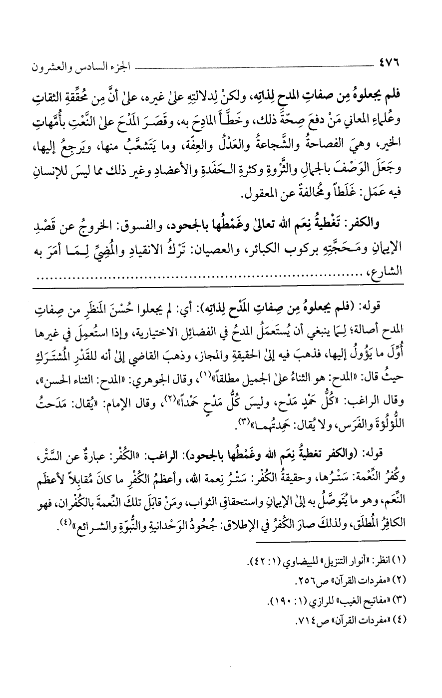 فلم يجعلوه من صفات المدح لذاته، ولكن لدلالته على غيره، على أن من محققة الثقات وعلماء المعاني من دفع صحة ذلك، وخطأ المادح به، وقصر المدح على النعت بأمّهات الخير، وهي الفصاحة والشجاعة والعدل والعفة، وما يتشعب منها، ويرجع إليها، وجعل الوصف بالجمال والثروة وكثرة الحفدة والأعضاد وغير ذلك مما ليس للإنسان فيه عمل: غلطًا ومخالفة عن المعقول.