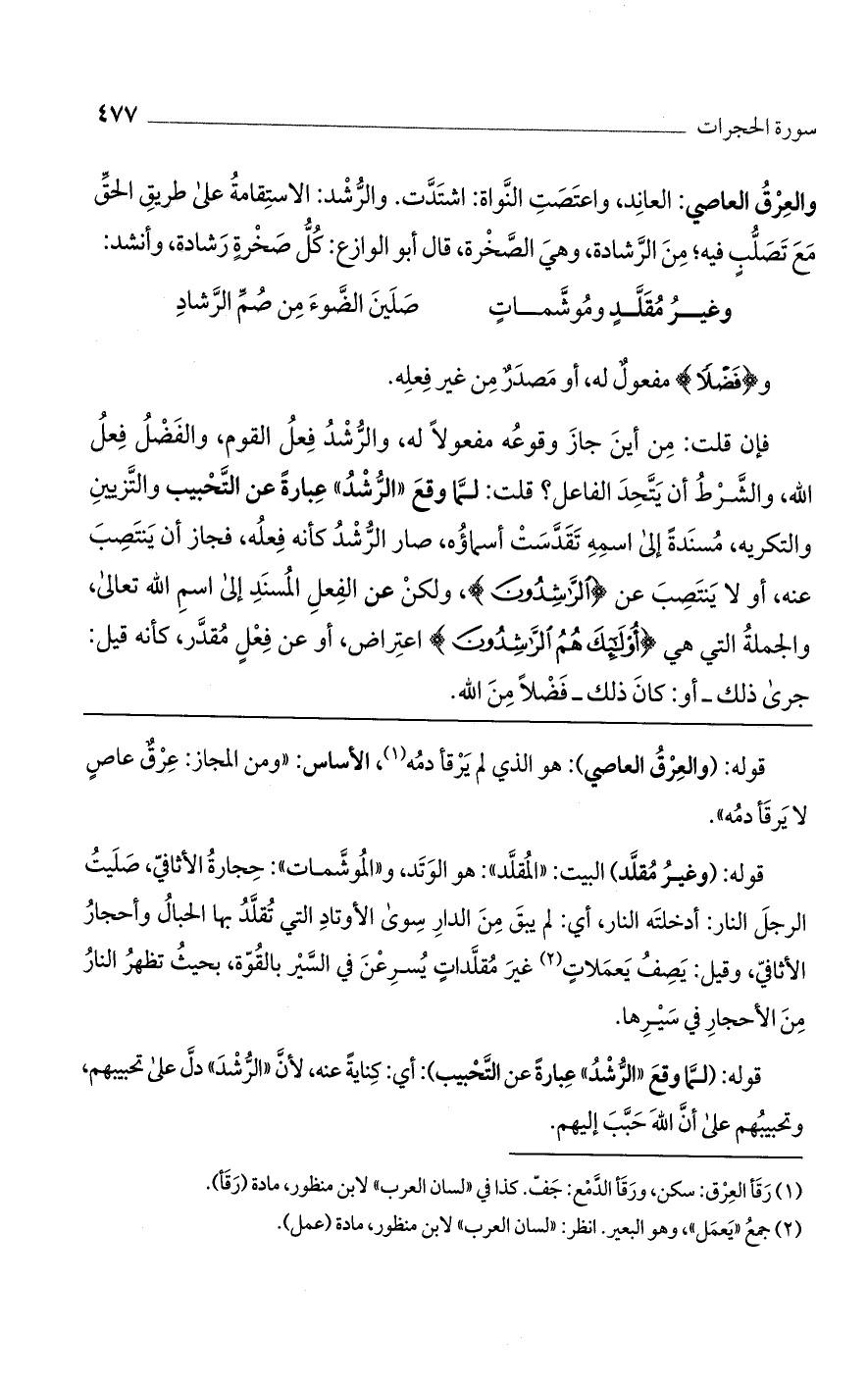 فإن قلت: من أين جاز وقوعه مفعولًا له، والرشد فعل القوم، والفضل فعل الله، والشرط أن يتحد الفاعل؟ قلت: لما وقع "الرشد" عبارة عن التحبيب والتزيين والتكريه، مسندة إلى اسمه تقدست أسماؤه، صار الرشد كأنه فعله، فجاز أن ينتصب عنه، أو لا ينتصب عن {الرَّاشِدُونَ}، ولكن عن الفعل المسند إلى اسم الله تعالى، والجملة التي هي: {أُولئِكَ هُمُ الرَّاشِدُونَ} اعتراض، أو عن فعل مقدر، كأنه قيل: جرى ذلك -أو كان ذلك- فضلًا من الله.