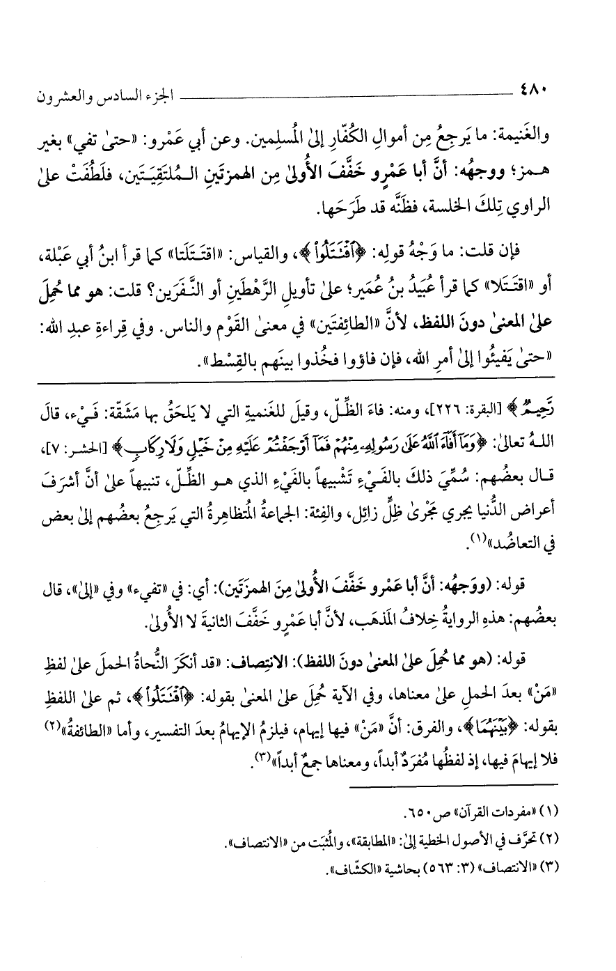 فإن قلت: ما وجه قوله: {اقْتَتَلُوا}، والقياس: "اقتتلتا" كما قرأ ابن أبي عبلة، أو "اقتتلا" كما قرأ عبيد بن عمير؛ على تأويل الرهطين أو النفرين؟ قلت: هو مما حمل على المعنى دون اللفظ، لأنّ "الطائفتين" في معنى القوم والناس. وفي قراءة عبد الله: "حتى يفيئوا إلى أمر الله، فإن فاءوا فخذوا بينهم بالقسط".