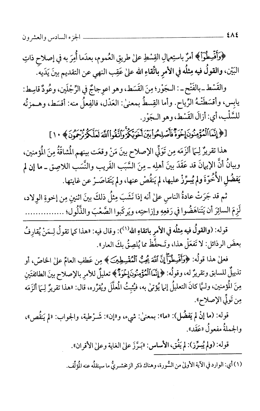 فعلى هذا قوله: {وأَقْسِطُوا إنَّ اللَّهَ يُحِبُّ المُقْسِطِينَ} من عطف العام على الخاص، أو تذييل للسابق وتقرير له، وقوله: {إنَّمَا المُؤْمِنُونَ إخْوَةٌ} تعليل للأمر بالإصلاح بين الطائفتين من المؤمنين، ولما كان التعليل إنما يؤتى به، فيثبت المعلل ويقرره، قال: "هذا تقرير لما ألزمه من تولي الإصلاح".