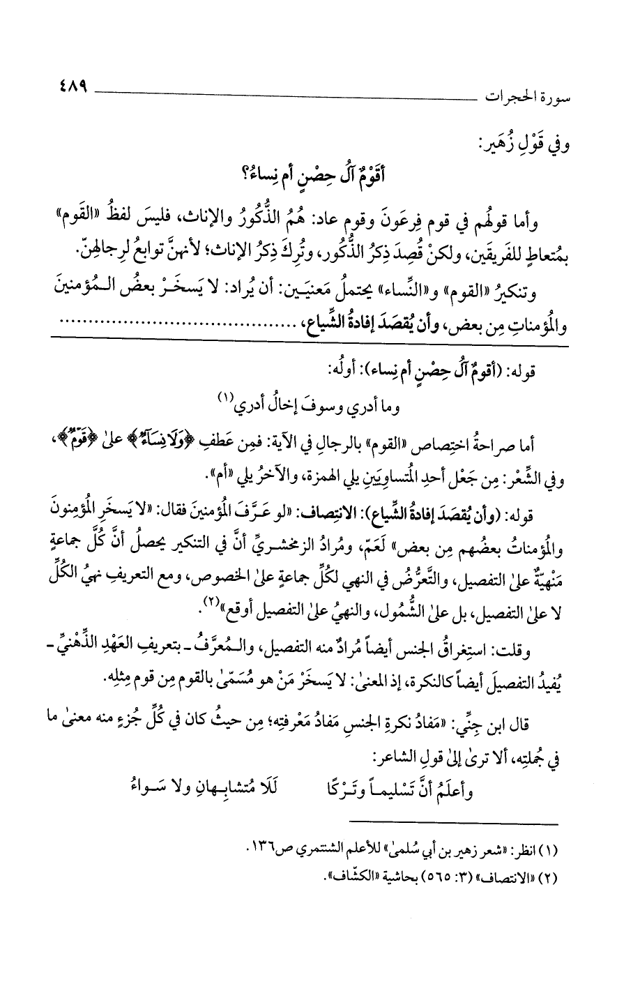 أما صراحة اختصاص "القوم" بالرجال في الآية: فمن عطف {وضلَا نِسَاءٌ} على {قَوْمٌ}، وفي الشعر: من جعل أحد المتساويين يلي الهمزة، والآخر يلي "أم".