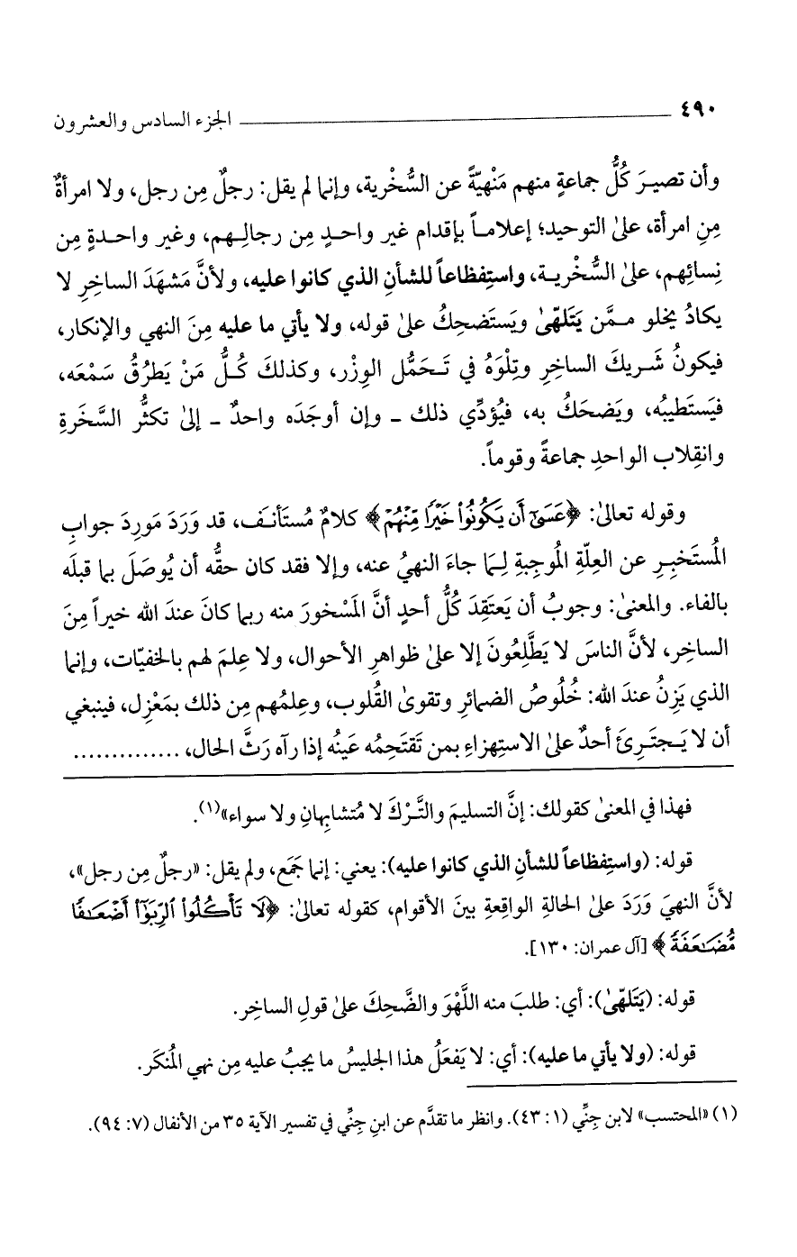 وأن تصير كل جماعة منهم منهية عن السخرية، وإنما لم يقل: رجل من رجل، ولا امرأة من امرأة، على التوحيد؛ إعلامًا بإقدام غير واحد من رجالهم، وغير واحدة من نسائهم، على السخرية، واستفظاعًا للشأن الذي كانوا عليه، ولأنّ مشهد الساخر لا يكاد يخلو ممن يتلهى ويستضحك على قوله، ولا يأتي ما عليه من النهي والإنكار، فيكون شريك الساخر وتلوه في تحمل الوزر، وكذلك كل من يطرق سمعه، فيستطيبه، ويضحك به، فيؤدي ذلك -وإن أوجده واحد- إلى تكثر السخرة وانقلاب الواحد جماعة وقومًا.