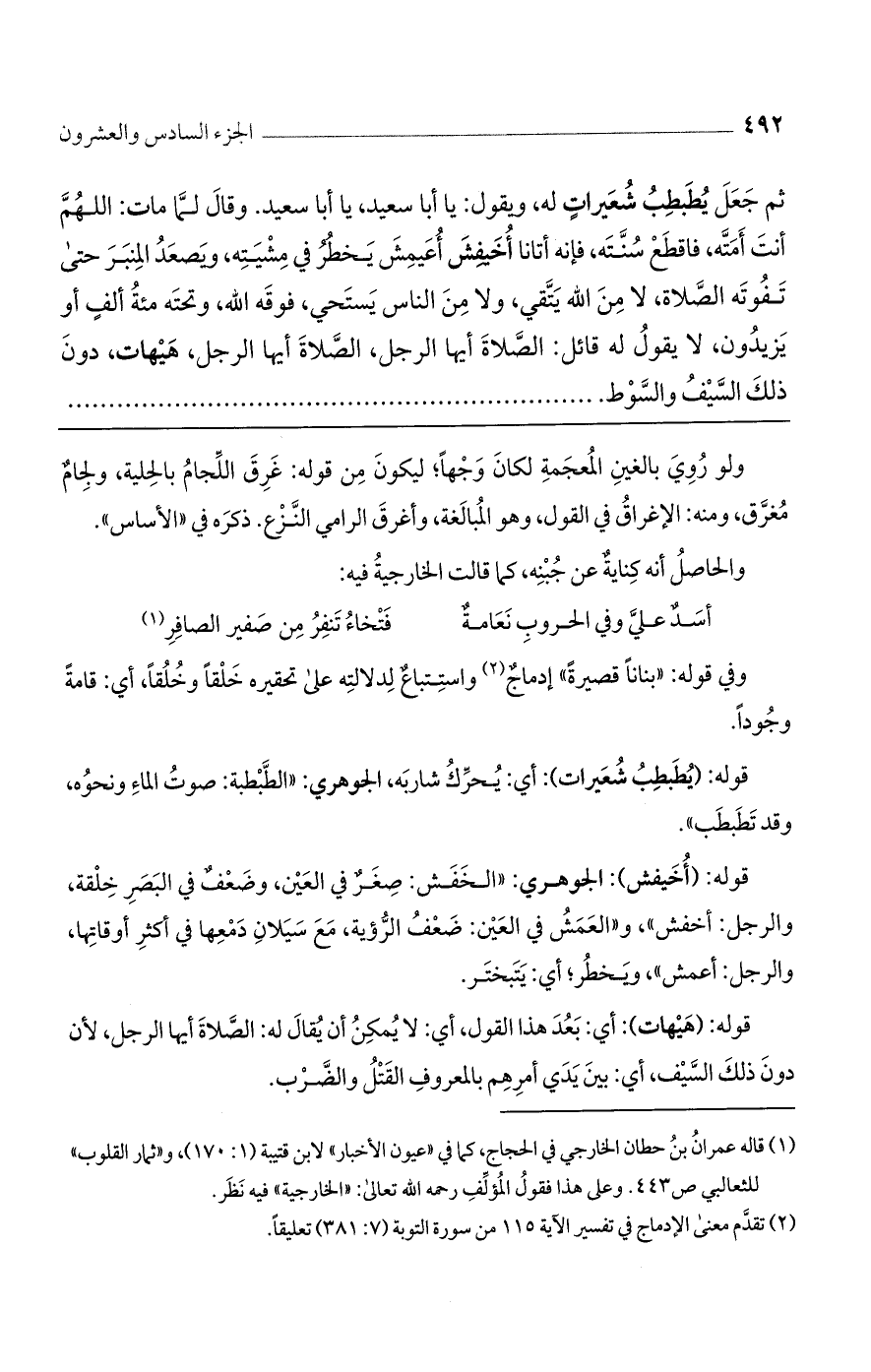 ثم جعل يطبطب شعيرات له، ويقول: يا أبا سعيد، يا أبا سعيد. وقال لما مات: اللهم أنت أمته، فاقطع سنته، فإنه أتانا أخيفش أعيمش يخطر في مشيته، ويصعد المنبر حتى تفوته الصلاة، لا من الله يتقي، ولا من الناس يستحي، فوقه الله، وتحته مائة ألف أو يزيدون، لا يقول له قائل: الصلاة أيها الرجل، الصلاة أيها الرجل، هيهات دون ذلك السيف والسوط.