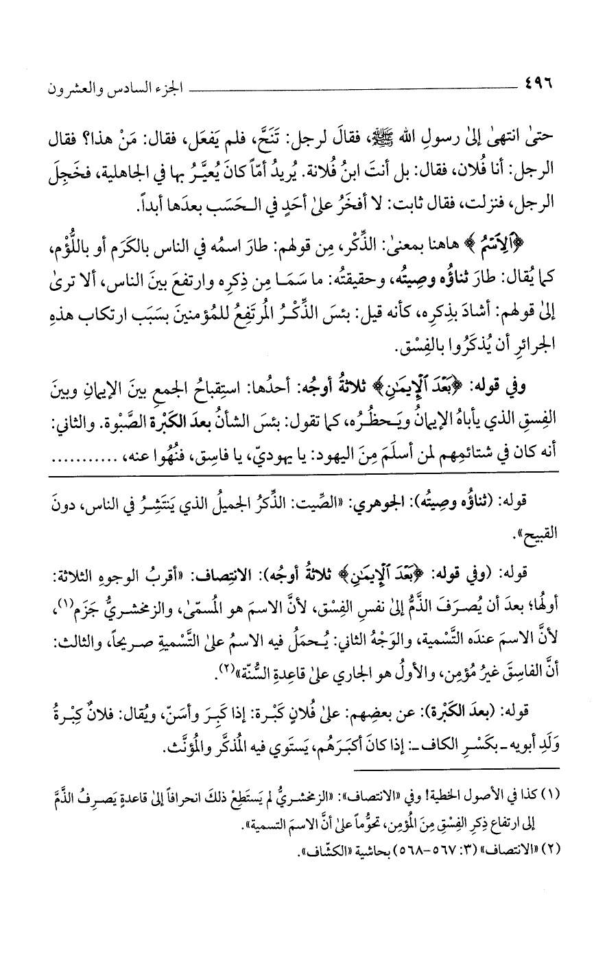 قوله: (وفي قوله: {بَعْدَ الإيمَانِ} ثلاثة أوجه): الانتصاف: "أقرب الوجوه الثلاثة: أولها؛ بعد أن يصرف الذم إلى نفس الفسق، لأن الاسم هو المسمى والزمخشري جزم، لأن الاسم عنده التسمية، والوجه الثاني: يحمل فيه الاسم على التسمية صريحًا، والثالث: أن الفاسق غير مؤمن، والأول هو الجاري على قاعدة السنة".