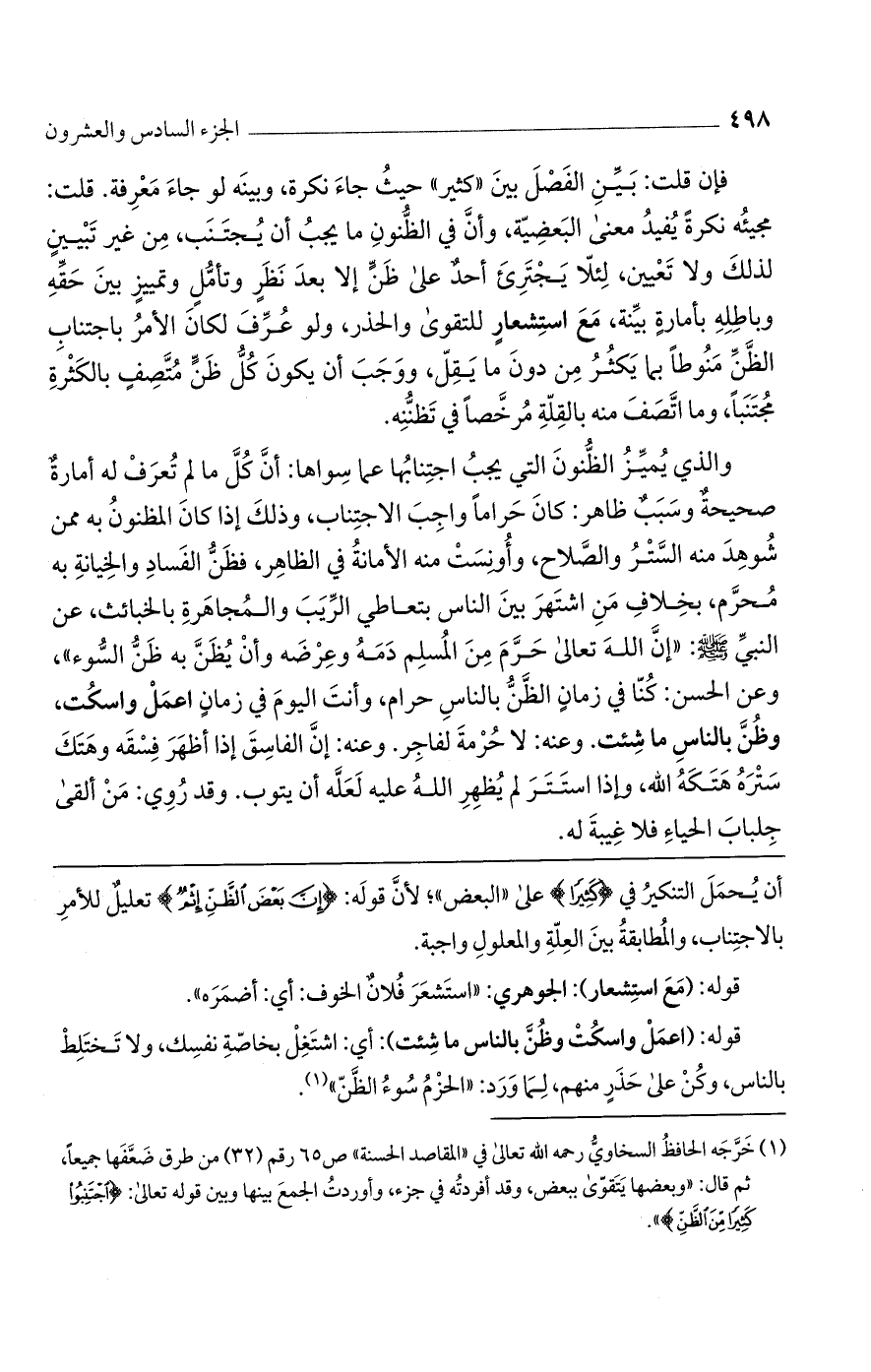 أن يحمل التنكير في {كَثِيرًا} على "البعض"؛ لأن قوله: {إنَّ بَعْضَ الظَّنِّ إثْمٌ} تعليل للأمر بالاجتناب، والمطابقة بين العلة والمعلول واجبة.