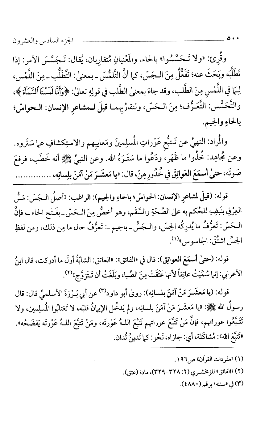 والمراد: النهي عن تتبع عورات المسلمين ومعايبهم والاستكشاف عما ستروه. وعن مجاهد: خذوا ما ظهر، ودعوا ما ستره الله. وعن النبي صلى الله عليه وسلم أنه خطب، فرفع صوته، حتى أسمع العواتق في خدورهنّ، قال: "يا معشر من آمن بلسانه،