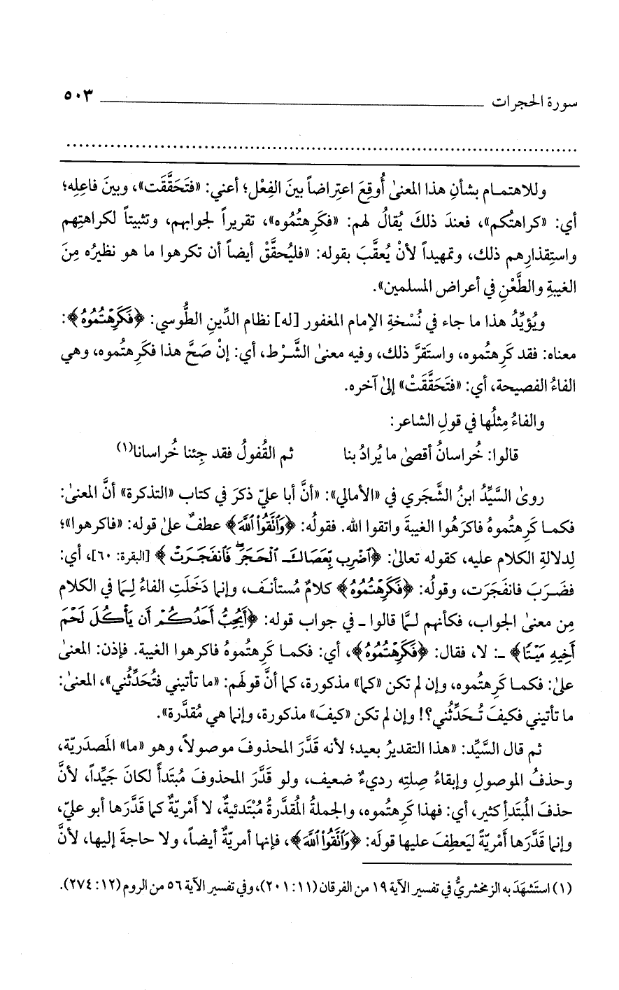 ويؤيد هذا ما جاء في نسخة الإمام المغفور [له] نظام الدين الطوسي: {فَكَرِهْتُمُوهُ} معناه: فقد كرهتموه، واستقر ذلك، وفيه معنى الشرط، أي: أن صح هذا فكرهتموه، وهي الفاء الفصيحة، أي: "فتحققت" إلى آخره.