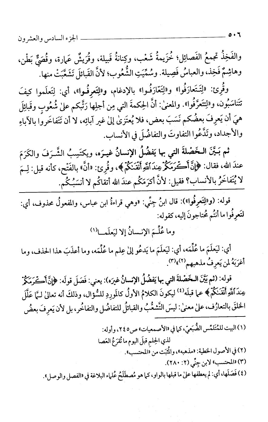وقرئ: "لتتعارفوا" و"لتعارفوا" بالإدغام، و"لتعرفوا"، أي: لتعلموا كيف تتناسبون، و"لتتعرفوا". والمعنى: أنّ الحكمة التي من أجلها رتبكم على شعوب وقبائل هي أن يعرف بعضكم نسب بعض، فلا يعتزى إلى غير آبائه، لا أن تتفاخروا بالآباء والأجداد، وتدعوا التفاوت والتفاضل في الأنساب.