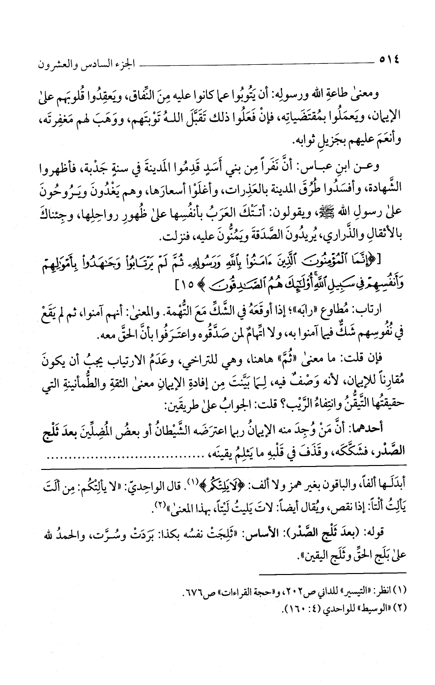 فإن قلت: ما معنى "ثم" ها هنا، وهي للتراخي، وعدم الارتياب يجب أن يكون مقارنًا للإيمان، لأنه وصف فيه، لما بينت من إفادة الإيمان معنى الثقة والطمأنينة التي حقيقتها التيقن وانتفاء الريب؟ قلت: الجواب على طريقين: