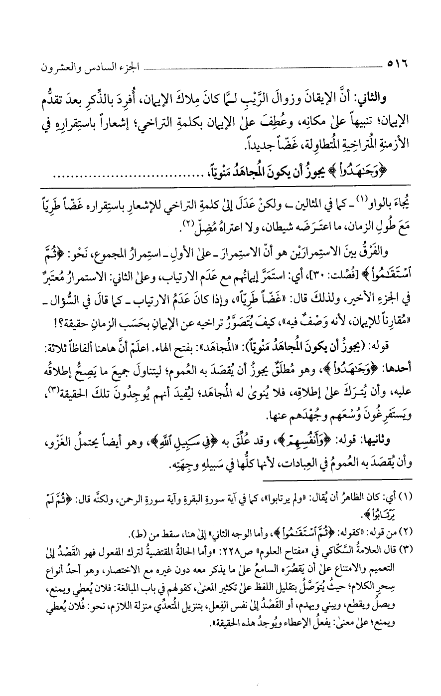 والفرق بين الاستمرارين هو أن الاستمرار_ على الأول_ استمرار المجموع، نحو: {ثُمَّ اسْتَقَامُوا} [فصلت: 30]، أي: استمر إيمانهم مع عدم الارتياب، وعلى الثاني: الاستمرار معتبر في الجزء الأخير، ولذلك قال: "غضًا طريًا"، وإذا كان عدم الارتياب_ كما قال في السؤال_ "مقارنًا للإيمان، لأنه وصف فيه""، كيف يتصور تراخيه عن الإيمان بحسب الزمان حقيقة؟ ! قوله: (يجوز أن يكون المجاهد منويًا): "المجاهد": بفتح الهاء. اعلم أن هاهنا ألفاظًا ثلاثة: أحدهما: {وَجَاهَدُوا}، وهو مطلق يجوز أن يقصد به العموم؛ ليتناول جميع ما يصح إطلاقه عليه، وأن يترك على إطلاقه، فلا ينوى له المجاهد؛ ليفيد أنهم يوجدون تلك الحقيقة، ويستفرغون وسعهم وجهدهم عنها.
