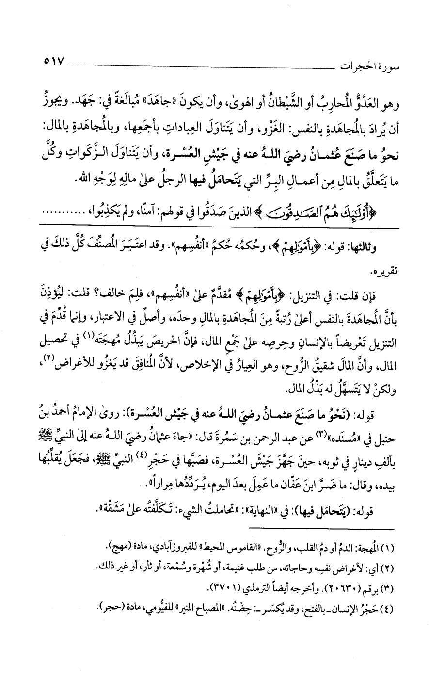 فإن قلت: في التنزيل: {بِأَمْوَالِهِمْ} مقدم على" أنفسهم"، فلم خالف؟ قلت: ليؤذن بأن المجاهدة بالنفس أعلى رتبة من المجاهدة بالمال وحده، وأصل في الاعتبار، وإنما قدم في التنزيل تعريضًا بالإنسان وحرصه على جمع المال، فإن الحريص يبذل مهجته في تحصيل المال، وأن المال شقيق الروح، وهو العيار في الإخلاص، لأن المنافق قد يغزو للأغراض، ولكن لا يتسهل له بذل المال.