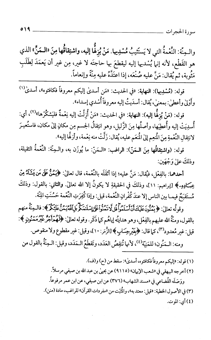 قوله: (واشتقاقها من المن): الراغب: "المن: ما يوزن به، والمنة: النعمة الثقيلة، وذلك على وجهين: