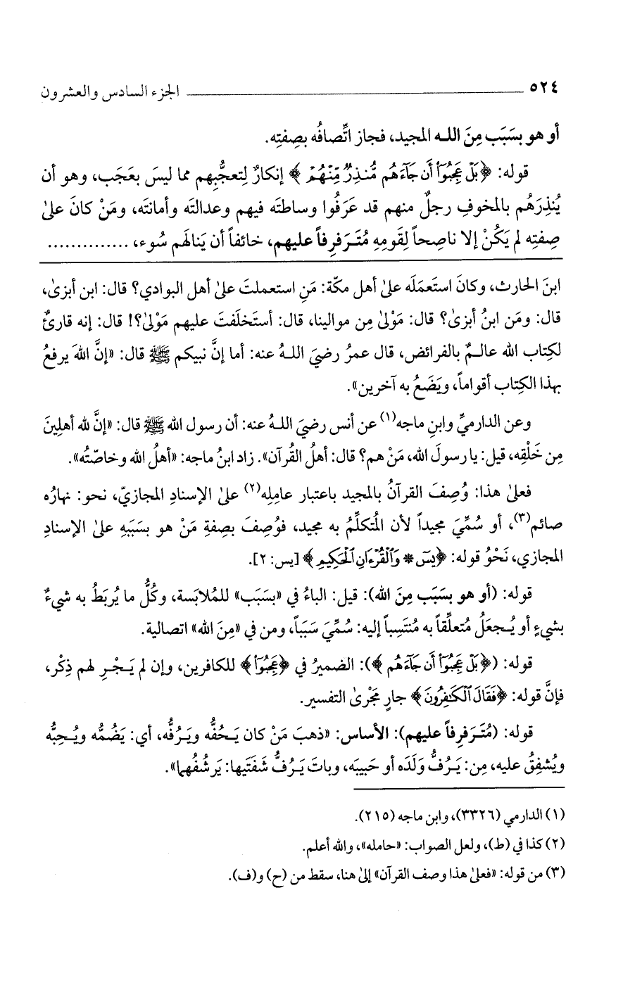 فعلى هذا: وصف القرآن بالمجيد باعتبار عامله على الإسناد المجازي، نحو: نهاره صائم، أو سمي مجيدًا لأن المتكلم به مجيد، فوصف بصفة من هو بسببه على الإسناد المجازي، نخو قوله: {يس * وَالْقُرْآَنِ الْحَكِيمِ} [يس: 2].