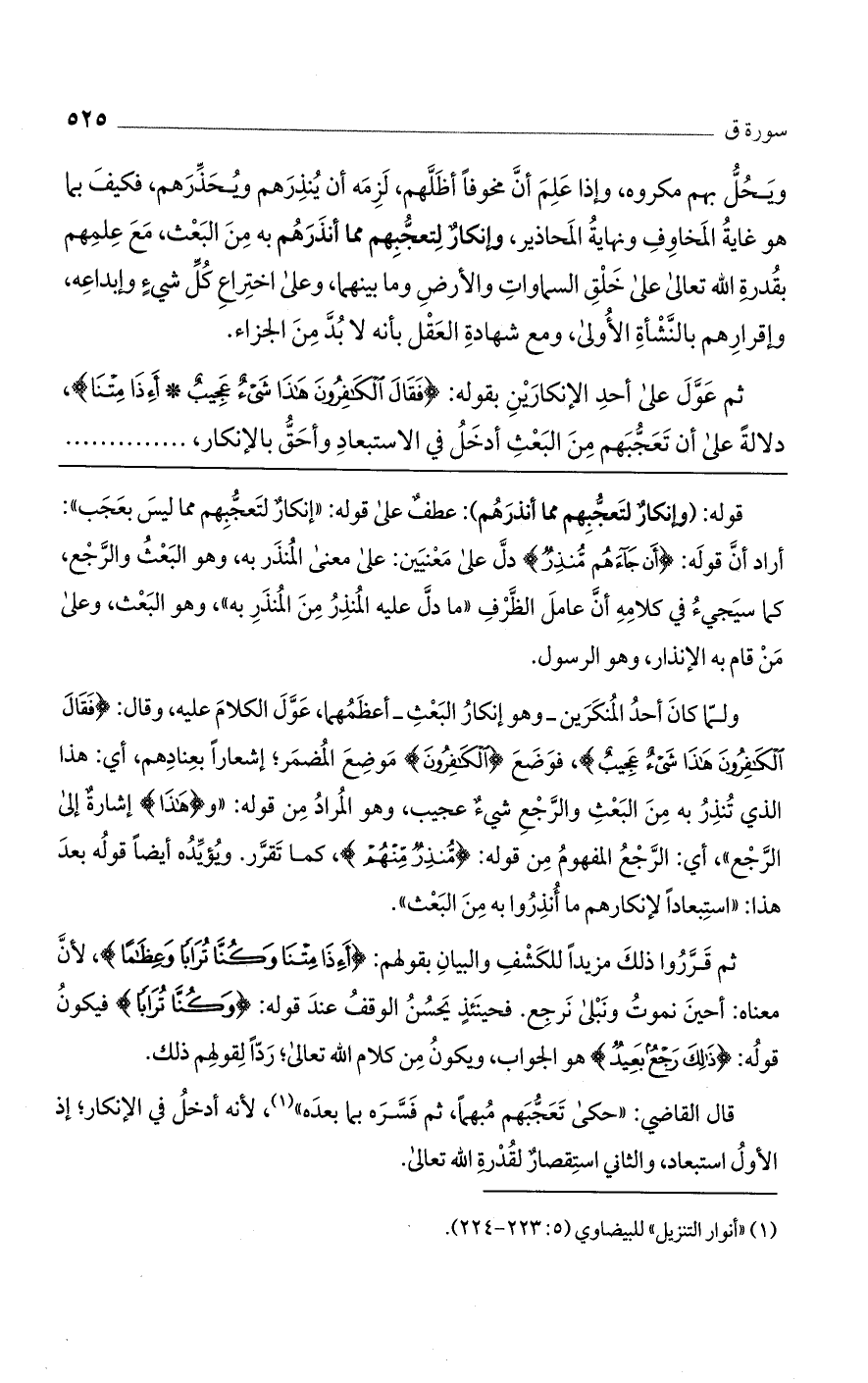 ولما كان أحد المنكرين_ وهو إنكار البعث_ أعظمهما، عول الكلام عليه، وقال: {فَقَالَ الكَافِرُونَ هَذَا شَيْءٌ عَجِيبٌ}، فوضع {الكَافِرُونَ} موضع الضمير؛ إشعارًا بعنادهم، أي: هذا الذي تنذر به من البعث والرجع شيء عجيب، وهو المراد من قوله: "و {هَذَا} إشارة إلى الرجع"، أي: الرجع المفهوم من قوله: {مُنْذِرٌ مِنْهُمْ}، كما تقرر. ويؤيده أيضًا قوله بعد هذا: "استبعادًا لإنكارهم ما أنذروا به من البعث".