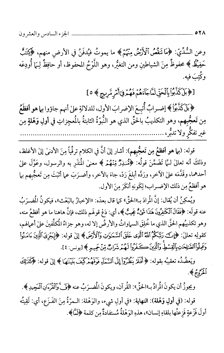 ويمكن أن يقال: أن المراد بـ"لحق" كما قال بعده: "الإخبار بالبعث"، فيكون المضرب عنه قوله: {فَقَالَ الكَافِرُونَ هَذَا شَيْءٌ عَجِيبٌ}، أي: دع قولهم ذلك، فإن هاهنا ما هو أفظع منه، وهو تكذيبهم الحق الذي ما خلق السماوات والأرض إلا له، وهو جزاء المكلفين على أعمالهم، كقوله تعالى: {إِنَّ رَبَّكُمُ اللَّهُ الَّذِي خَلَقَ السَّمَاوَاتِ وَالْأَرْضَ} إلى قوله: {لِيَجْزِيَ الَّذِينَ آَمَنُوا وَعَمِلُوا الصَّالِحَاتِ بِالْقِسْطِ وَالَّذِينَ كَفَرُوا لَهُمْ شَرَابٌ مِنْ حَمِيمٍ} [يونس: 4].
