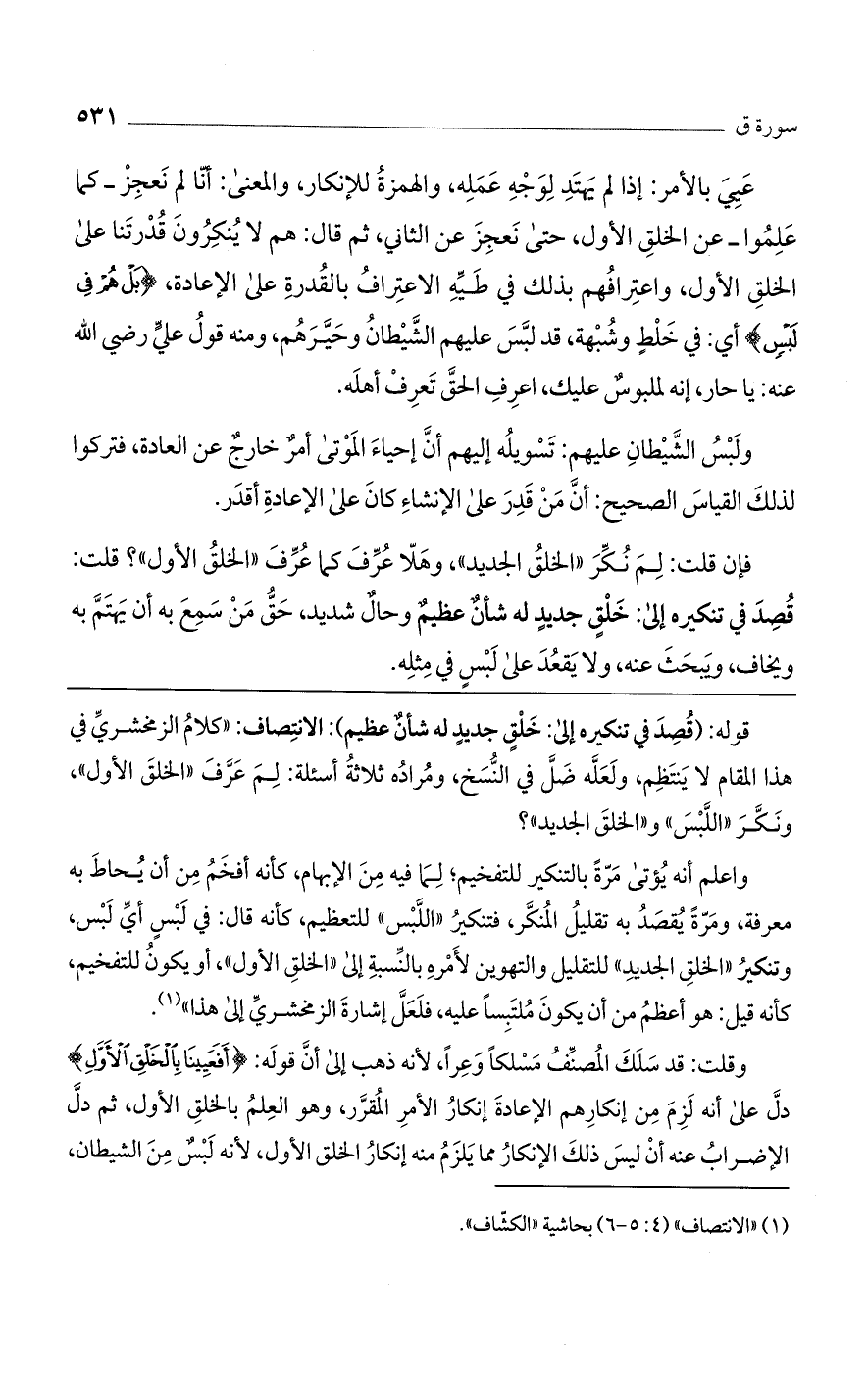 فإن قلت: لم نكر "الخلق الجديد"، وهلا عرّف كما عرّف "الخلق الأول"؟ قلت: قصد في تنكيره إلى: خلق جديد له شأن عظيم وحال شديد، حق من سمع به أن يهتم به ويخاف، ويبحث عنه، ولا يقعد على لبس في مثله.