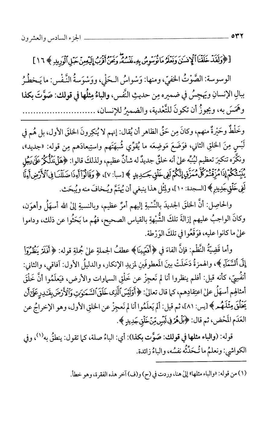 قوله: (والباء مثلها في قولك: صوت بكذا): أي: الباء صلة، كما تقول: ينطق به، وفي الكواشي: ونعلم ما تحدثه نفسه، والباء زائدة.