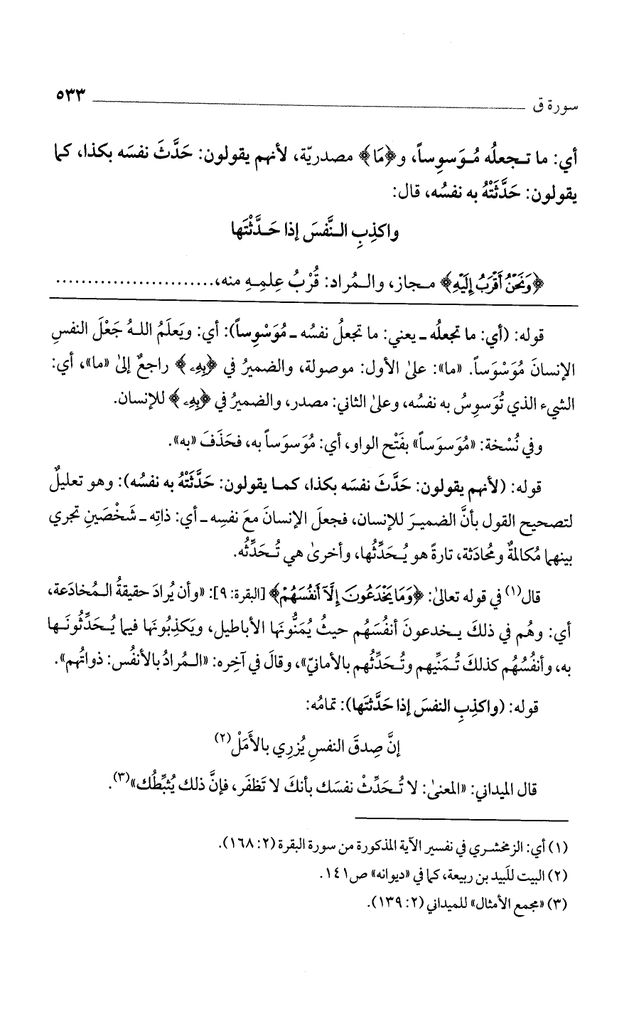 قوله: (لأنهم يقولون: حدث نفسه بكذا، كما يقولون: حدثته به نفسه): وهو نعليل لتصحيح القول بأن الضمير للإنسان، فجعل الإنسان مع نفسه_ أي: ذاته_ شخصين تجري بينهما مكالمة ومحادثة، تارة هو يحدثها، وأخرى هي تحدثه.