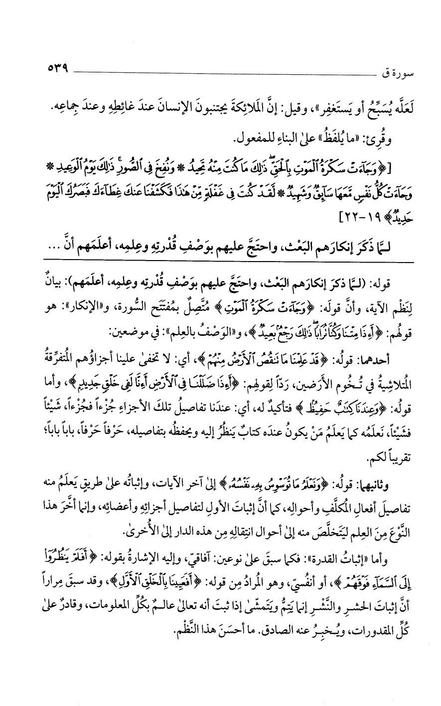 قوله: (لما ذكر إنكارهم البعث، واحتج عليهم بوصف قدرته وعلمه، أعلمهم): بيان لنظم الآية، وأن قوله: {وجَاءَتْ سَكْرَةُ المَوْتِ} متصل بمفتتح السورة، و"الإنكار": هو قولهم: {أَئِذَا مِتْنَا وكُنَّا تُرَابًا ذَلِكَ رَجْعٌ بَعِيدٌ}، و"الوصف بالعلم": في موضعين: