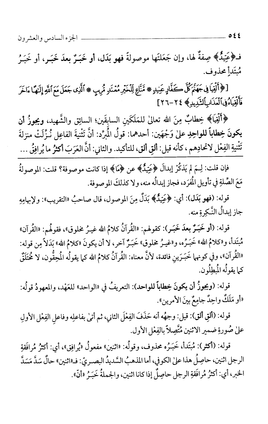 {أَلْقِيا} خطاب من الله تعالى للملكين السابقين؛ السائق والشهيد، ويجوز أن يكون خطابًا للواحد على وجهين: أحدهما: قول المبرد: أن تثنية الفاعل نزلت منزلة تثنية الفعل لاتحادهم، كأنه قيل: ألق ألق، للتأكيد. والثاني: أنّ العرب أكثر ما يرافق