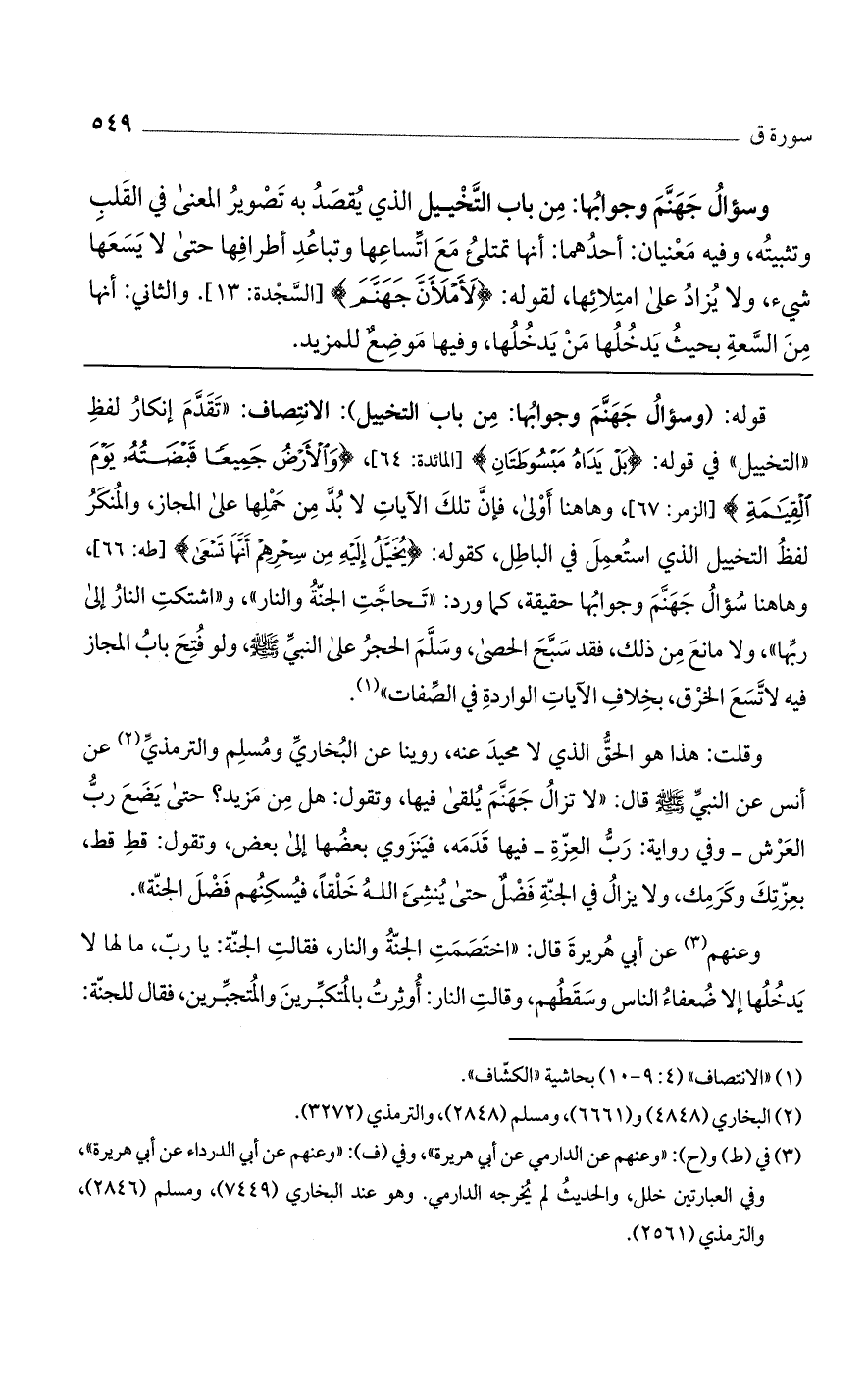 قوله: (وسؤال جهنم وجوابها: من باب التخييل): الانتصاف: " تقدم إنكار لفظ "التخييل" في قوله: {بَلْ يَدَاهُ مَبْسُوطَتَانِ} [المائدة: 64]، {وَالْأَرْضُ جَمِيعًا قَبْضَتُهُ يَوْمَ الْقِيَامَةِ} [الزمر: 67]، وها هنا أولى، فإن تلك الآيات لا بد من حملها على المجاز، والمنكر لفظ التخييل الذي استعمل في الباطل، كقوله: {يُخَيَّلُ إِلَيْهِ مِنْ سِحْرِهِمْ أَنَّهَا تَسْعَى} [طه: 66]، وها هنا سؤال جهنم وجوابها حقيقة، كما ورد: "تحاجت الجنة والنار"، و"اشتكت النار إلى ربها"، ولا مانع من ذلك، فقد سبح الحصى، وسلم الحجر على النبي صلى الله عليه وسلم، ولو فتح باب المجاز فيه لاتسع الخرق، بخلاف الآيات الواردة في الصفات".