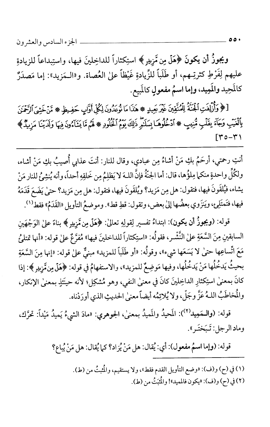 قوله: (ويجوز أن يكون): ابتداء تفسير لقوله تعالى: {هَلْ مِن مَّزِيدٍ} بناء على الوجهين السابقين من السعة على النشر، فقوله: "استكثارًا للداخلين فيها" مفرع على قوله: "أنها تمتلئ مع اتساعها حتى لا يسعها شيء"، وقوله: "أو طلبًا للمزيد" مبني على قوله: "إنها من السعة بحيث يدخلها من يدخلها، وفيها موضع للمزيد"، والاستفهام في قوله: {هَلْ مِن مَّزِيدٍ}: إذا كان بمعنى استكثار الداخلين كان في معنى النفي، وهو مشكل؛ لأنه حينئذ بمعنى الداخلين كان في معنى النفي، وهو مشكل؛ لأنه حينئذ بمعنى الإنكار، والمخاطب الله عز وجل، ولا يلائمه أيضًا معنى الحديث الذي أوردناه.