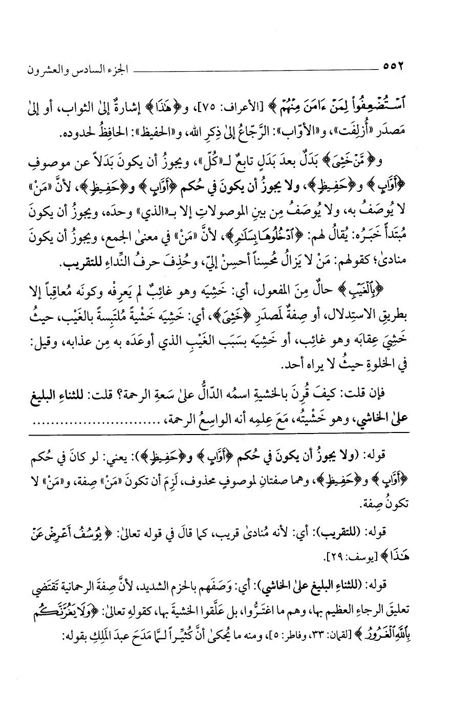 قوله: (ولا يجوز أن يكون في حكم {أَوَّابٍ} و {حَفِيظٍ}): يعني: لو كان في حكم {أَوَّابٍ} و {حَفِيظٍ}، وهما صفتان لموصوف محذوف، لزم أن تكون "من" صفة، و"من" لا تكون صفة.