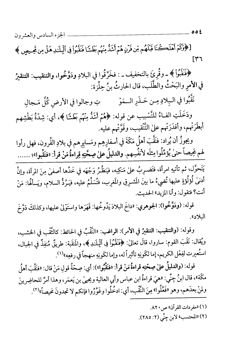 قوله: (والدليل على صحته قراءة من قرأ: "فنقبوا"): أي: قول من قال: "فنقب أهل مكة"، قال ابن جني: "هي قراءة ابن عباس وأبي العالية ويحيي بن يعمر، وهذا أمر للحاضرين ولمن بعدهم، وهو "فعلوا" من النقب، أي: ادخلوا وغوروا فإنكم لا تجدون محيصًا".