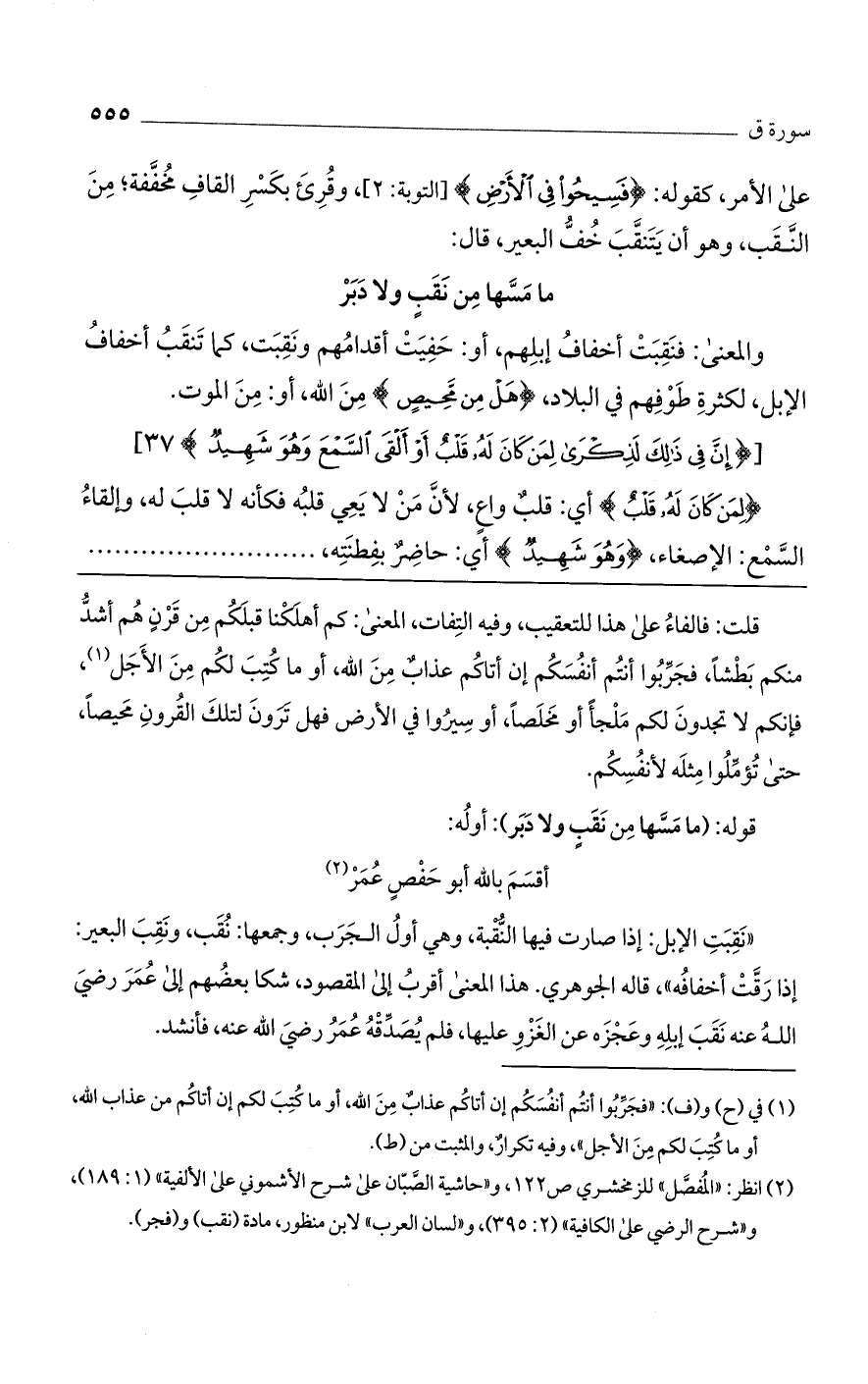 والمعنى: فنقبت أخفاف إبلهم، أو: حفيت أقدامهم ونقبت، كما تنقب أخفاف الإبل، لكثرة طوفهم في البلاد، {هَلْ مِنْ مَحِيصٍ} من الله، أو: من الموت.