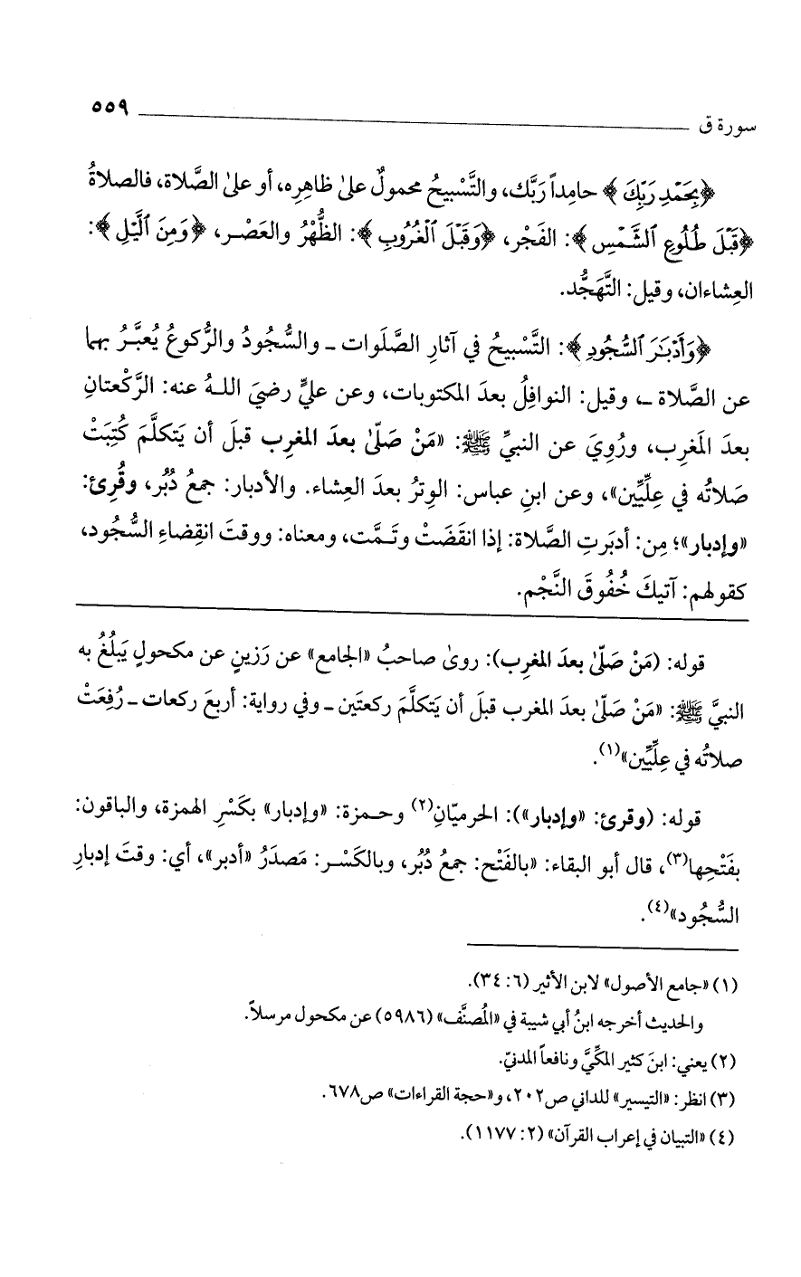 قوله: (وقرئ: "وإدبار"): الحرميان وحمزة: "وإدبار" بكسر الهمزة، والباقون: بفتحها، قال أبو البقاء: "بالفتح: جمع دبر، وبالكسر: مصدر "أدبر"، أي: وقت إدبار السجود".