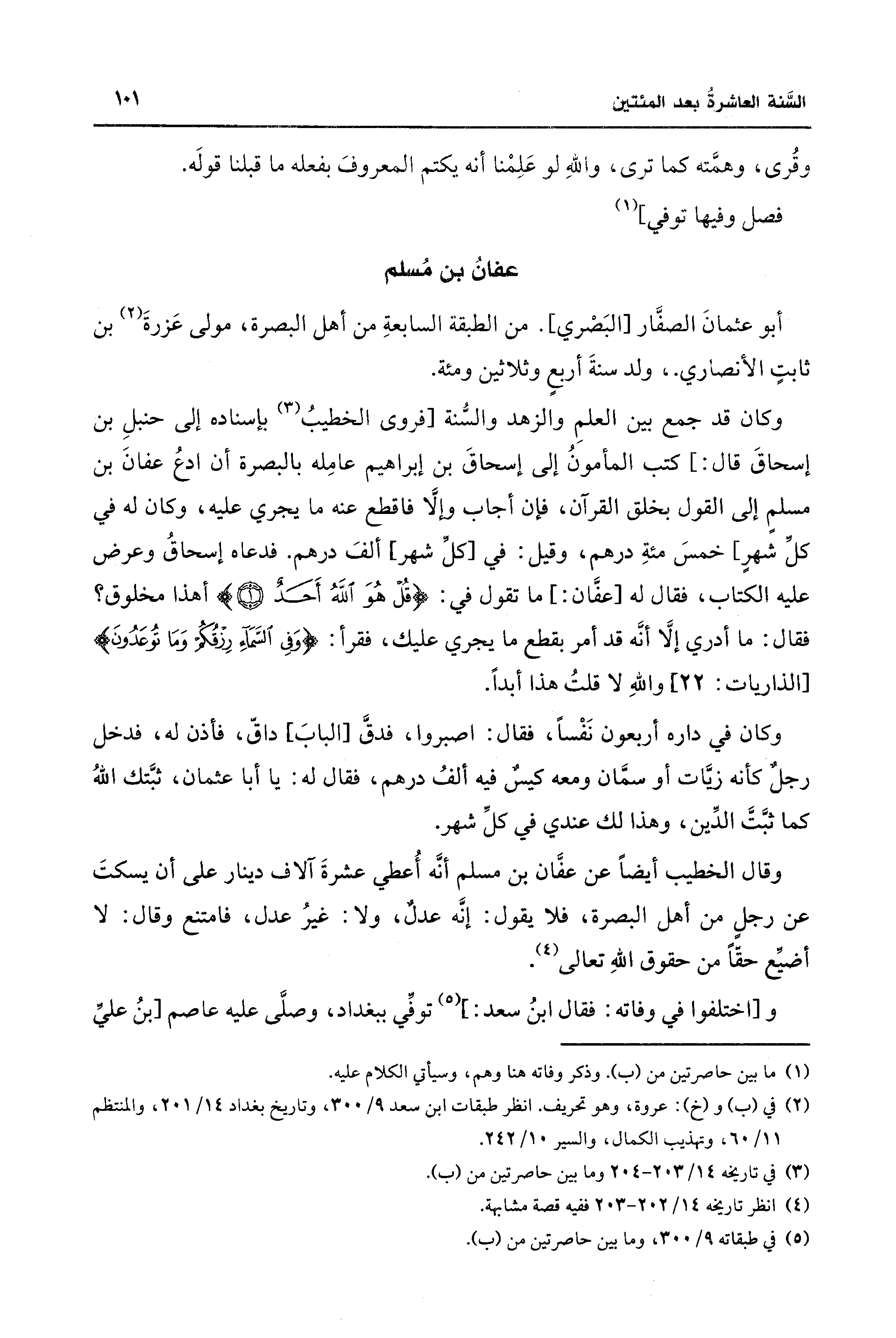 وكان قد جمع بين العلمِ والزهد والسُّنة [فروى الخطيبُ (¬3) بإسناده إلى حنبلِ بن إسحاقَ قال: ] كتب المأمونُ إلى إسحاقَ بن إبراهيم عامِله بالبصرة أن ادعُ عفانَ بن مسلمٍ إلى القول بخلق القرآن، فإن أجاب وإلَّا فاقطع عنه ما يجري عليه، وكان له في كلِّ شهرٍ] خمسَ مئةِ درهم، وقيل: في [كلِّ شهر] ألفَ درهم. فدعاه إسحاقُ وعرض عليه الكتاب، فقال له [عفَّان: ] ما تقول في: {قُلْ هُوَ اللَّهُ أَحَدٌ} أهذا مخلوق؟ فقال: ما أدري إلَّا أنَّه قد أمر بقطع ما يجري عليك، فقرأ: {وَفِي السَّمَاءِ رِزْقُكُمْ وَمَا تُوعَدُونَ} [الذاريات: 22] واللهِ لا قلتُ هذا أبدًا.