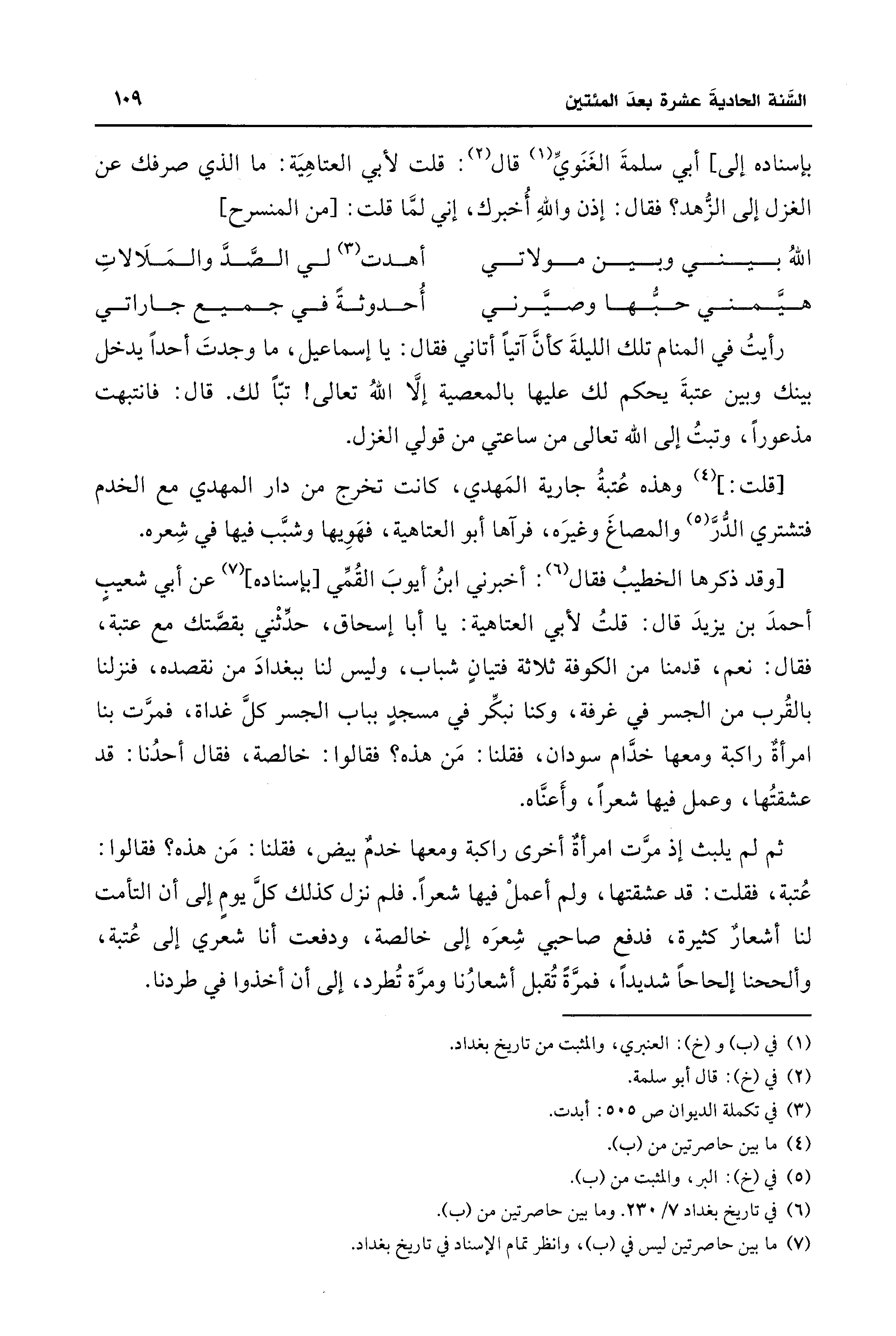 [وقد ذكرها الخطيبُ فقال (¬6): أخبرني ابنُ أيوبَ القُمِّي [بإسناده] (¬7) عن أبي شعيب أحمدَ بن يزيدَ قال: قلتُ لأبي العتاهية: يا أبا إسحاق، حدِّثْني بقصَّتك مع عتبة، فقال: نعم، قدمنا من الكوفة ثلاثة فتيانٍ شباب، وليس لنا ببغدادَ من نقصده، فنزلنا بالقُرب من الجسر في غرفة، وكنا نبكِّر في مسجدٍ بباب الجسر كلَّ غداة، فمرَّت بنا امرأةٌ راكبة ومعها خدَّام سودان، فقلنا: مَن هذه؟ فقالوا: خالصة، فقال أحدُنا: قد عشقتُها، وعمل فيها شعرًا، وأَعنَّاه.