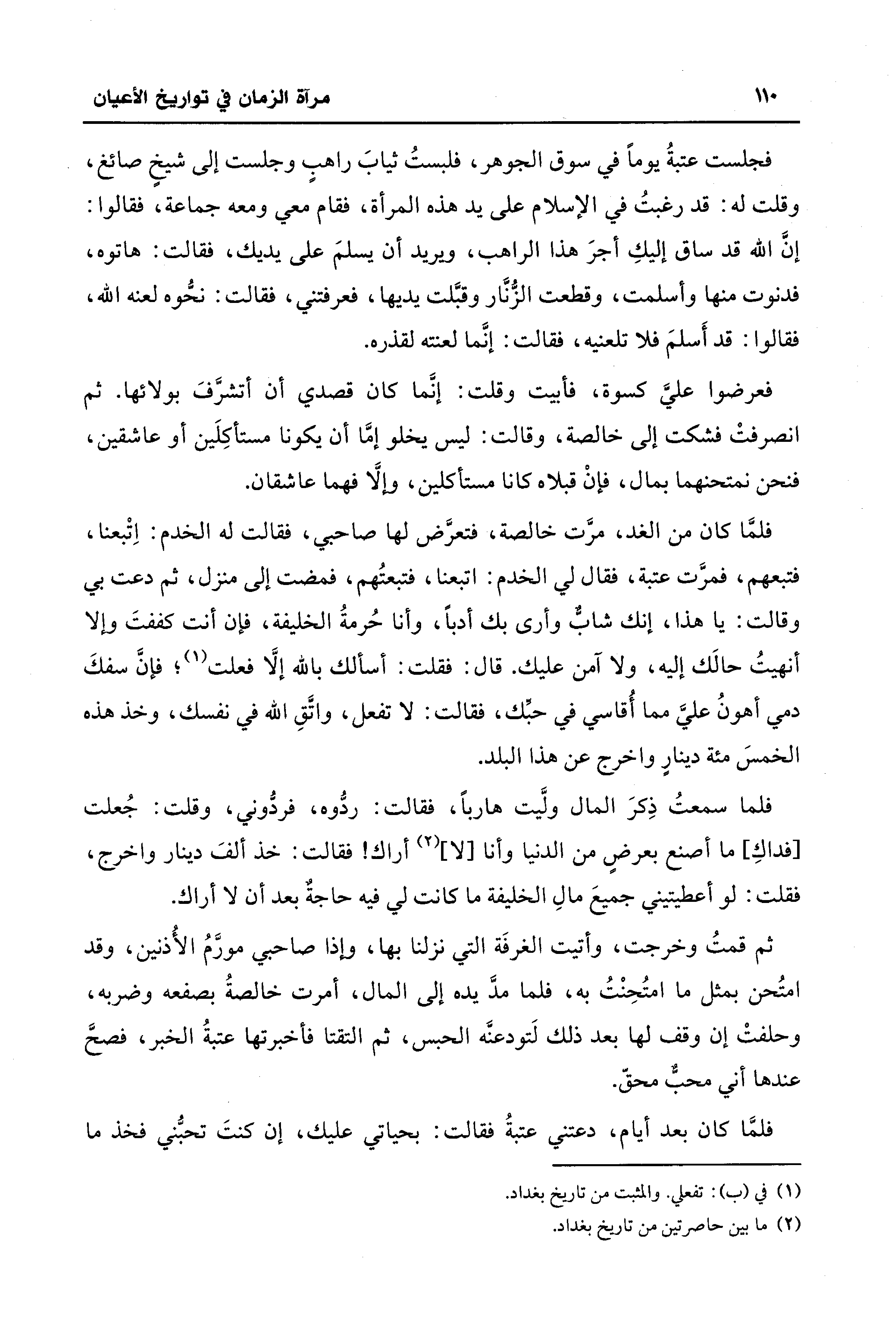 فجلست عتبةُ يومًا في سوق الجوهر، فلبستُ ثيابَ راهبٍ وجلست إلى شيخٍ صائغ، وقلت له: قد رغبتُ في الإسلام على يد هذه المرأة، فقام معي ومعه جماعة، فقالوا: إنَّ الله قد ساق إليكِ أجرَ هذا الراهب، ويريد أن يسلمَ على يديك، فقالت: هاتوه، فدنوت منها وأسلمت، وقطعت الزُّنَّار وقبَّلت يديها، فعرفتني، فقالت: نحُّوه لعنه الله، فقالوا: قد أَسلمَ فلا تلعنيه، فقالت: إنَّما لعنته لقذره.