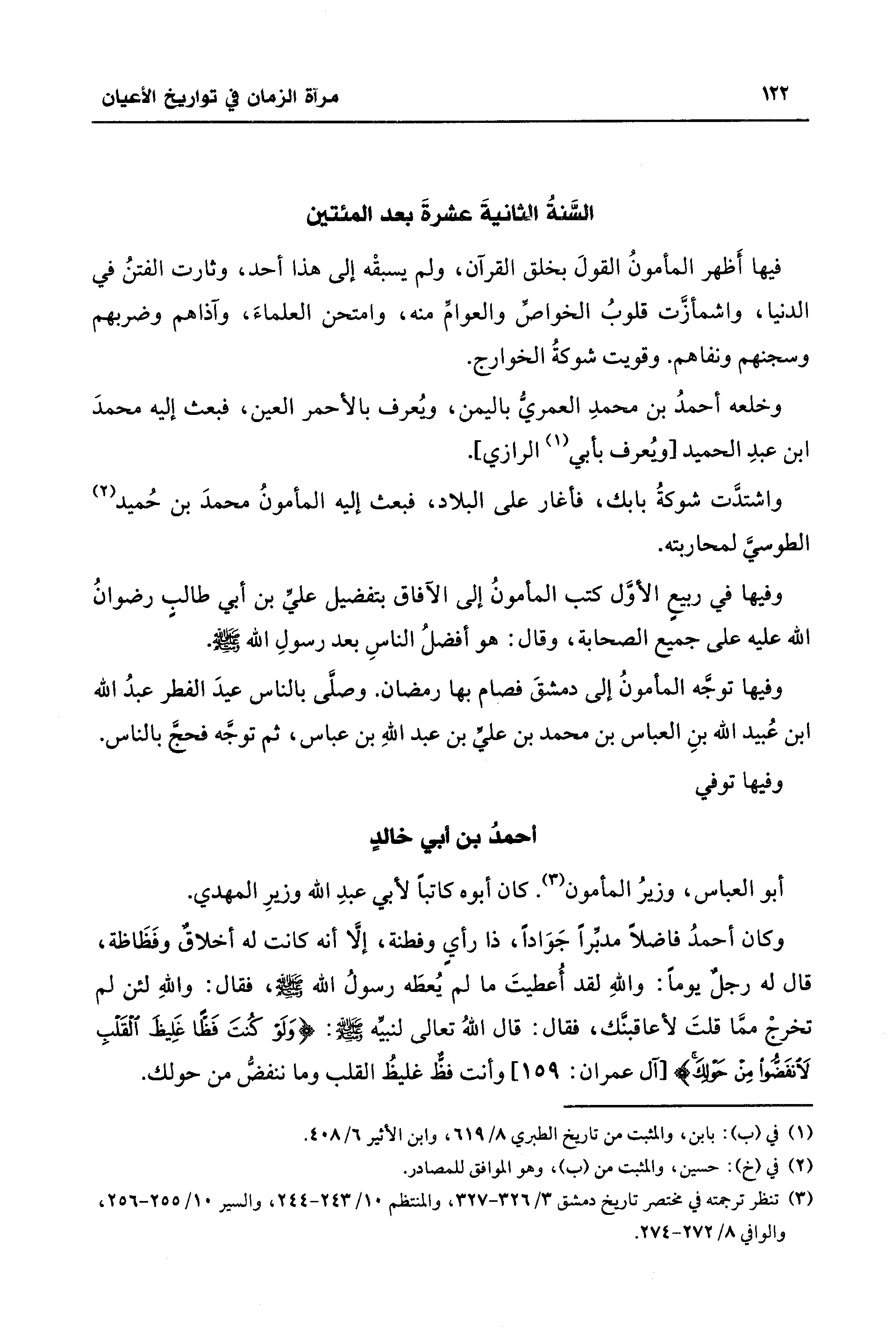 فيها أَظهر المأمونُ القولَ بخلق القرآن، ولم يسبقْه إلى هذا أحد، وثارت الفتنُ في الدنيا، واشمأزَّت قلوبُ الخواصِّ والعوامِّ منه، وامتحن العلماءَ، وآذاهم وضربهم وسجنهم ونفاهم. وقويت شوكةُ الخوارج.