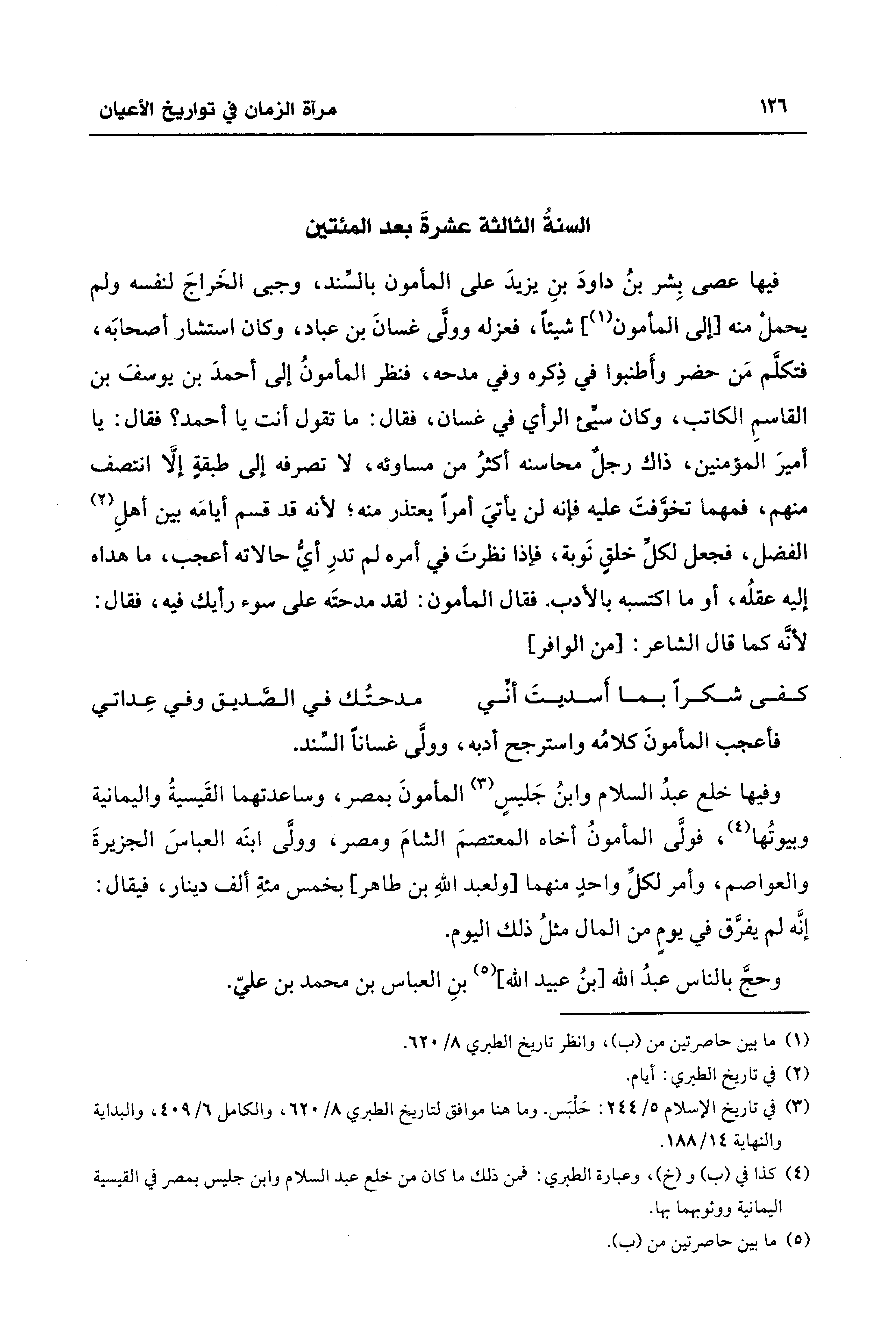 فيها عصى بِشر بنُ داودَ بنِ يزيدَ على المأمون بالسِّند، وجبى الخَراجَ لنفسه ولم يحملْ منه [إلى المأمون (¬1)] شيئًا، فعزله وولَّى غسانَ بن عباد، وكان استشار أصحابَه، فتكلَّم مَن حضر وأَطنبوا في ذِكره وفي مدحه، فنظر المأمون إلى أحمدَ بن يوسفَ بن القاسمِ الكاتب، وكان سيِّئ الرأي في غسان، فقال: ما تقول أنت يا أحمد؟ فقال: يا أميرَ المؤمنين، ذاك رجلٌ محاسنه أكثرُ من مساوئه، لا تصرفه إلى طبقةٍ إلَّا انتصف منهم، فمهما تخوَّفتَ عليه فإنه لن يأتيَ أمرًا يعتذر منه؛ لأنه قد قسم أيامَه بين أهلِ (¬2) الفضل، فجعل لكلِّ خلقٍ نَوبة، فإذا نظرتَ في أمره لم تدرِ أيُّ حالاته أعجب، ما هداه إليه عقلُه، أو ما اكتسبه بالأدب. فقال المأمون: لقد مدحتَه على سوء رأيك فيه، فقال: لأنَّه كما قال الشاعر: [من الوافر]